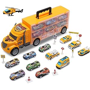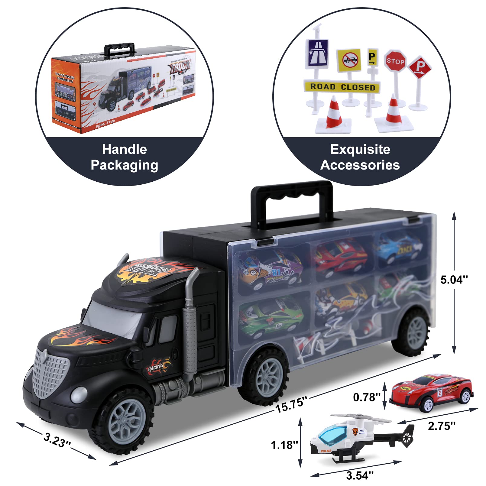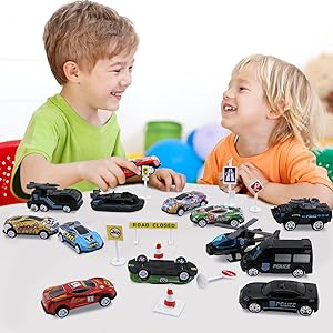 - u3010Abundant Die-Cast Kids Toddler Toysu3011This car toys for 3 4 5 6 7 year old boys comes with 12 car slots for storage and a snap-close lid ensuring the 6 mini police cars, 6 small racing car toys and 8 PCS traffic signs are inside, double-side visible lid display all the kids trucks. Kids will love this 20-in-1 set of transport car carrier set