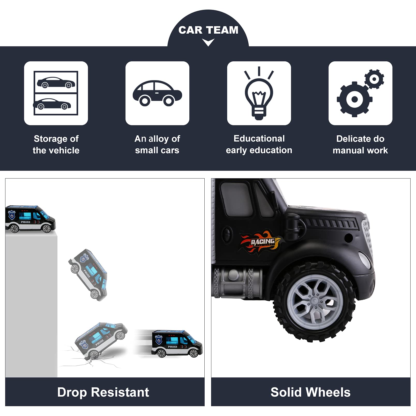 - u3010Educational Transport Storage Car Toyu3011 Car carrier truck toys is great for kids playing police truck or racing games, conductive to hand-eye coordination and the development of early preschool education, improving kid's practical ability through the sense of touch, good educational learning garage toy storage