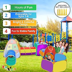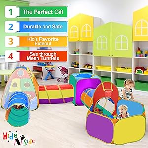 - EASY ASSEMBLY & STORAGE: The entire play jungle gym toy pops open in seconds! Tunnels fasten closed with frustration-free easy-locks. Teepee, Cube & Ball house play cave, fold away for convenient storage in the included lightweight carry case, to stow away compactly. Really easy activity toy to take along to Grandma's home! For indoors or outdoors use as backyard, parks, playground, daycare, preschool, nursery, playgroups. Avoid using this playpen on course surfaces like concrete or Pavement.
