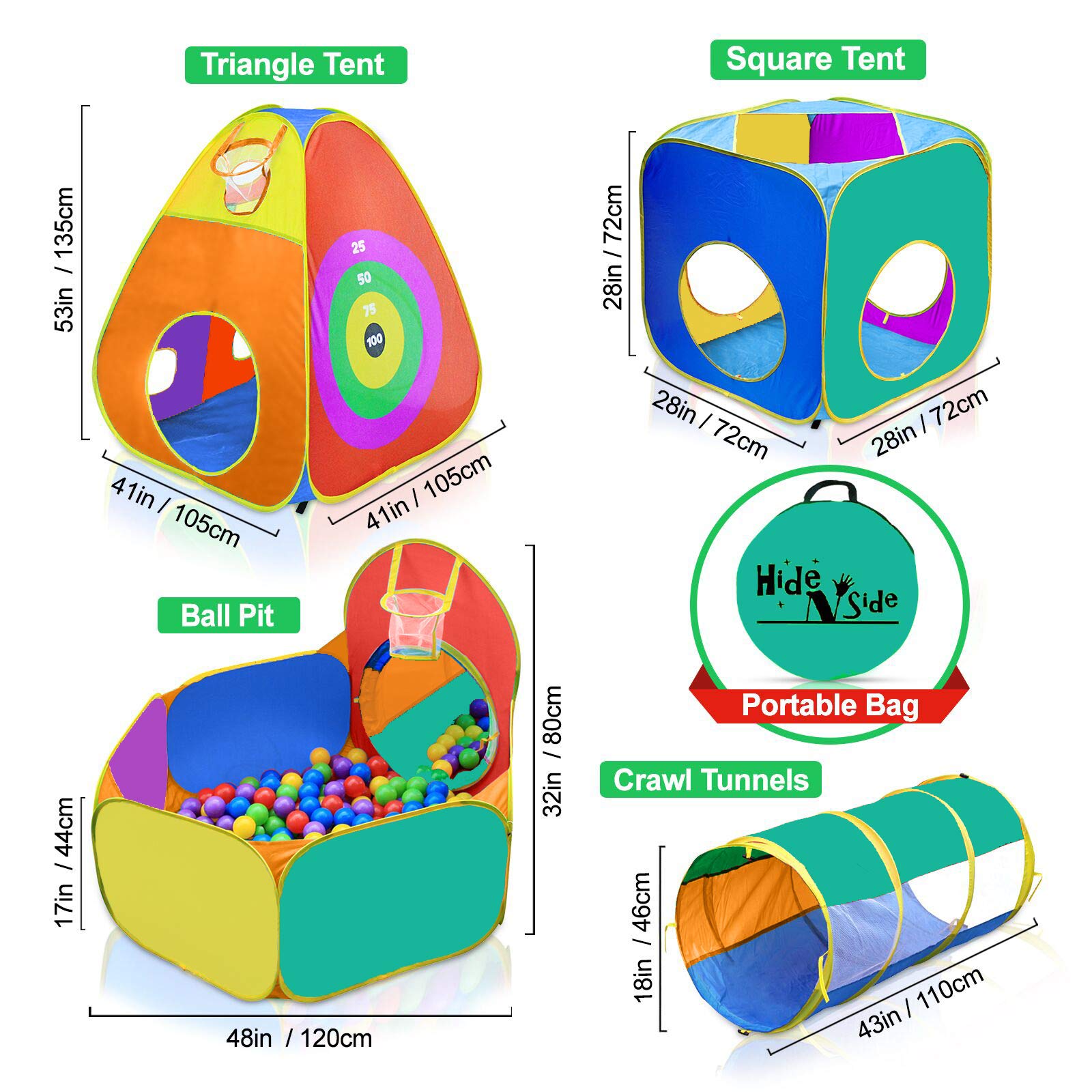 - LOADS OF FUN: This bright vibrant pop up ball pit playhouse obstacle course playset will keep children entertained for hours! Super cool TARGET WALL game (4 dart balls included) takes the FUN to a whole new level, and is enjoyable for the kids and parents!! Kids can customize the many different combination maze options, keeping this play set fun & exciting! A must toy for the active toddler, baby, cats n dogs! We recommend 400-600 balls depending on the ball size ud83dudc49BALL PIT BALLS NOT INCLUDEDud83dudc48
