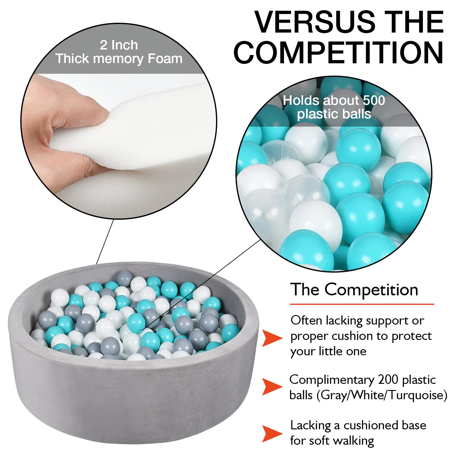 - Safe, Durable Construction - The foam ball pit and balls have smooth, rounded surfaces with nothing that is sharp, pointy, or hard. Made of quality plastic that is safe for children with no hazardous ingredients, impurities, or treatments. This pit is very elastic and won't bend, crease, wrinkle, or sag. This is major improvement not found in other brands.
