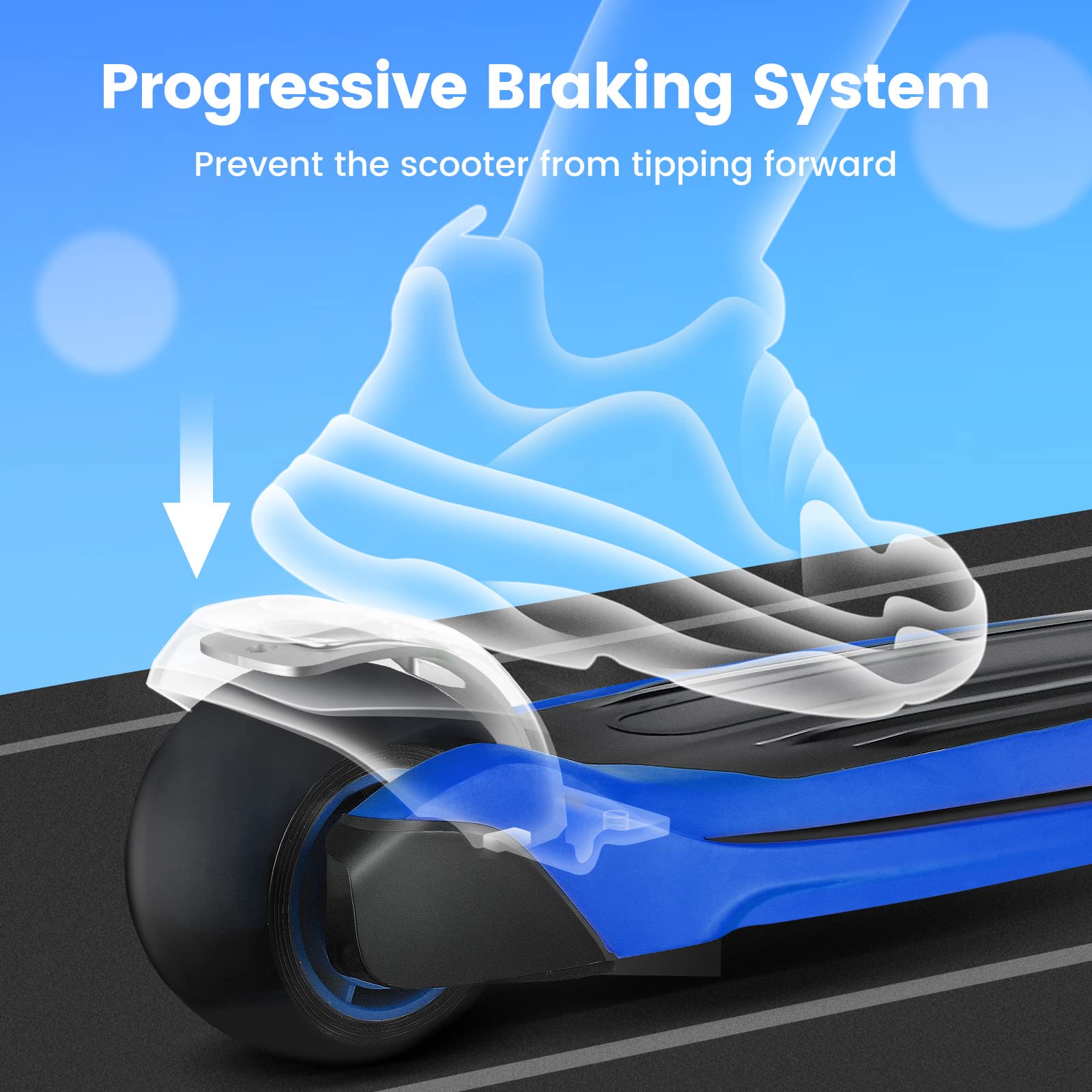- u3010Kids scooteru3011The progressive braking system prevents the scooter for kids ages 6-12 from rolling over due to sudden braking. TPR sweat-wicking handle can keep children's hands fresh and not sticky. Aluminum alloy reinforced frame, High-strength structural pedals and 5.11'' SUV-level widened pedals makes the actual bear weight is 110 pounds higher than similar products. The built-in stable triangular structure prevents rollover, bringing your kids a smooth and safe ride experience.
