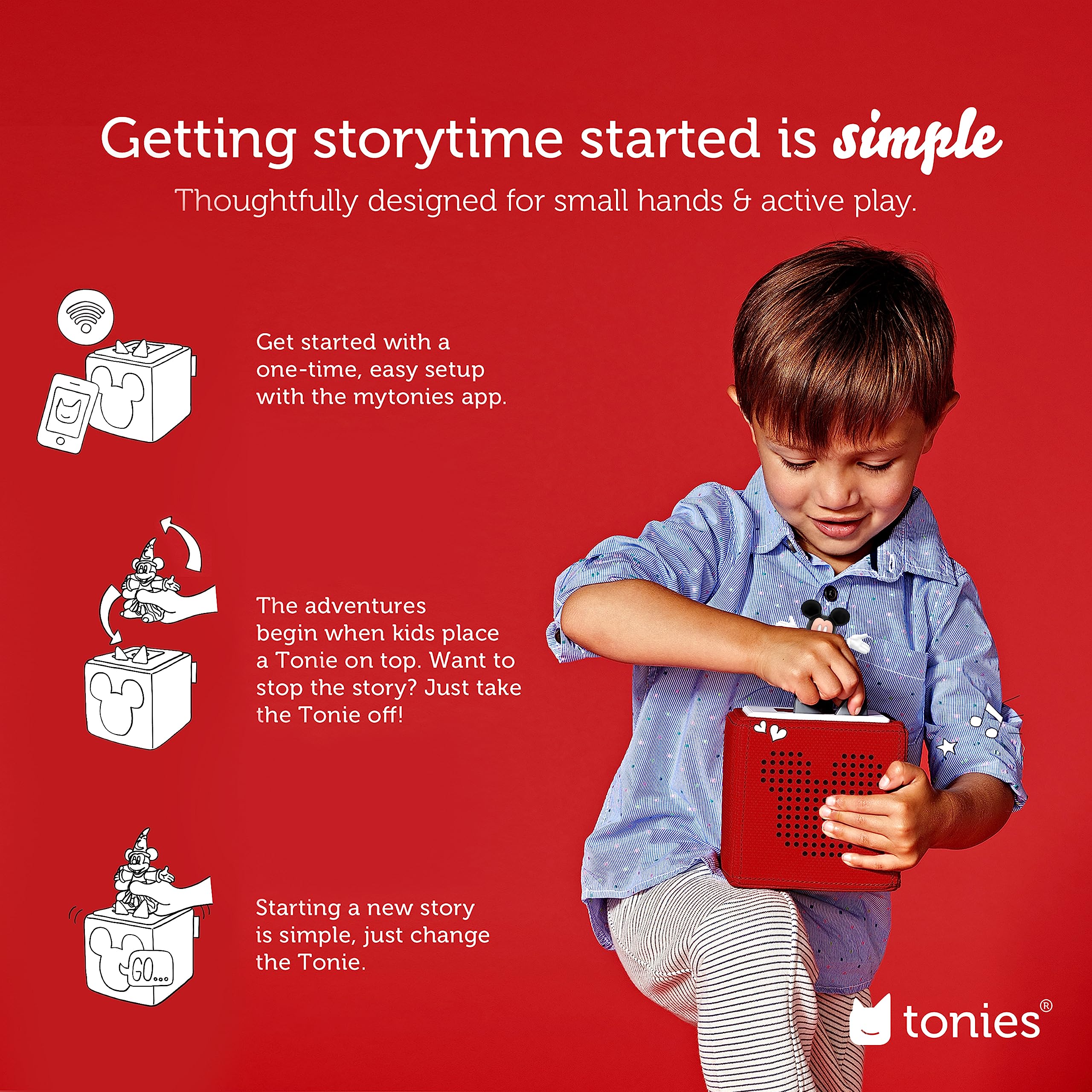 - Bundle includes a red Toniebox, charging station, Mickey Mouse, Minnie Mouse, Fantasia, & Holiday Mickey Tonies. Additional Tonies can be purchased separately.