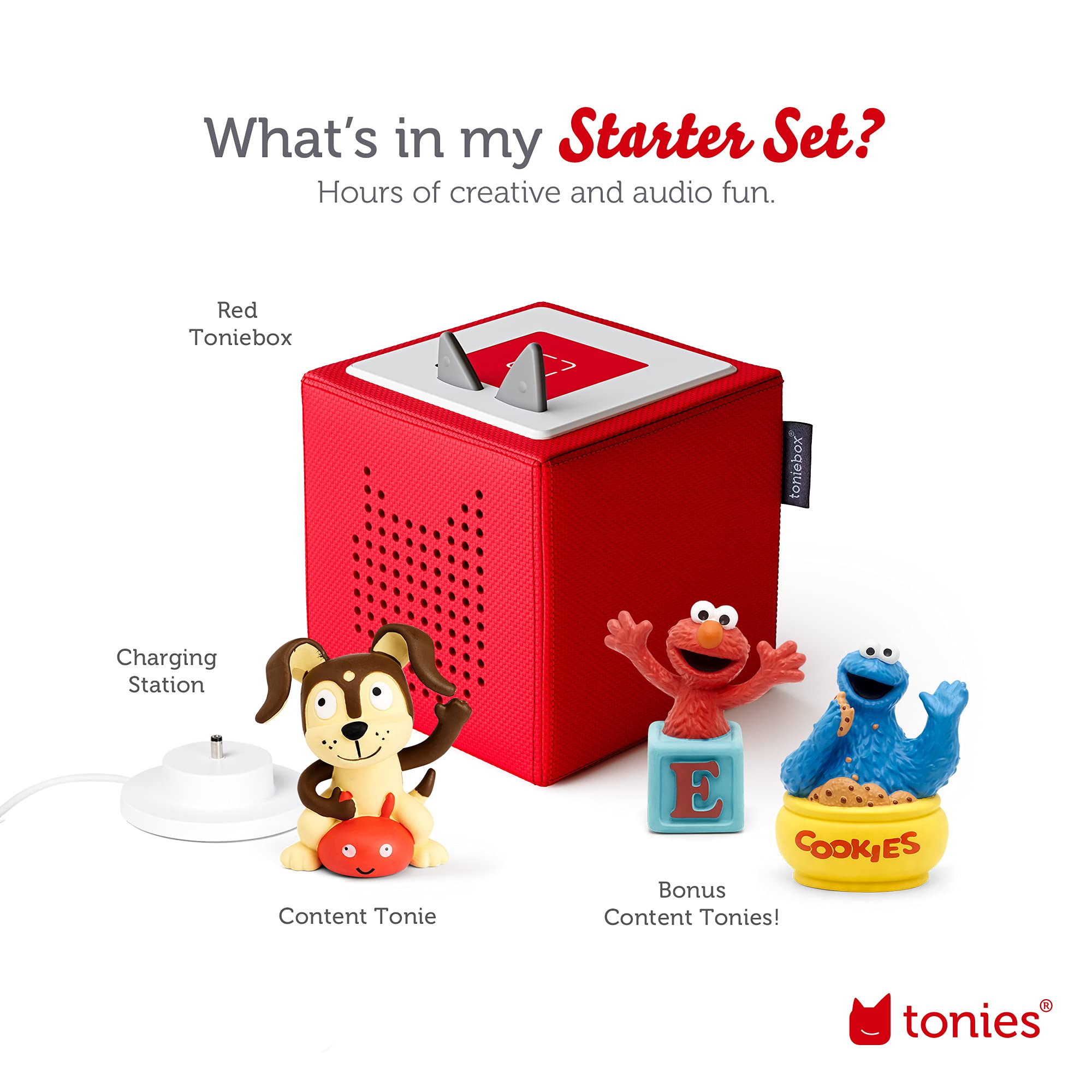 - Bundle includes a red Toniebox, charging station, Elmo Tonie, Cookie Monster Tonie, and Playtime Puppy Tonie. Additional Tonies can be purchased separately.