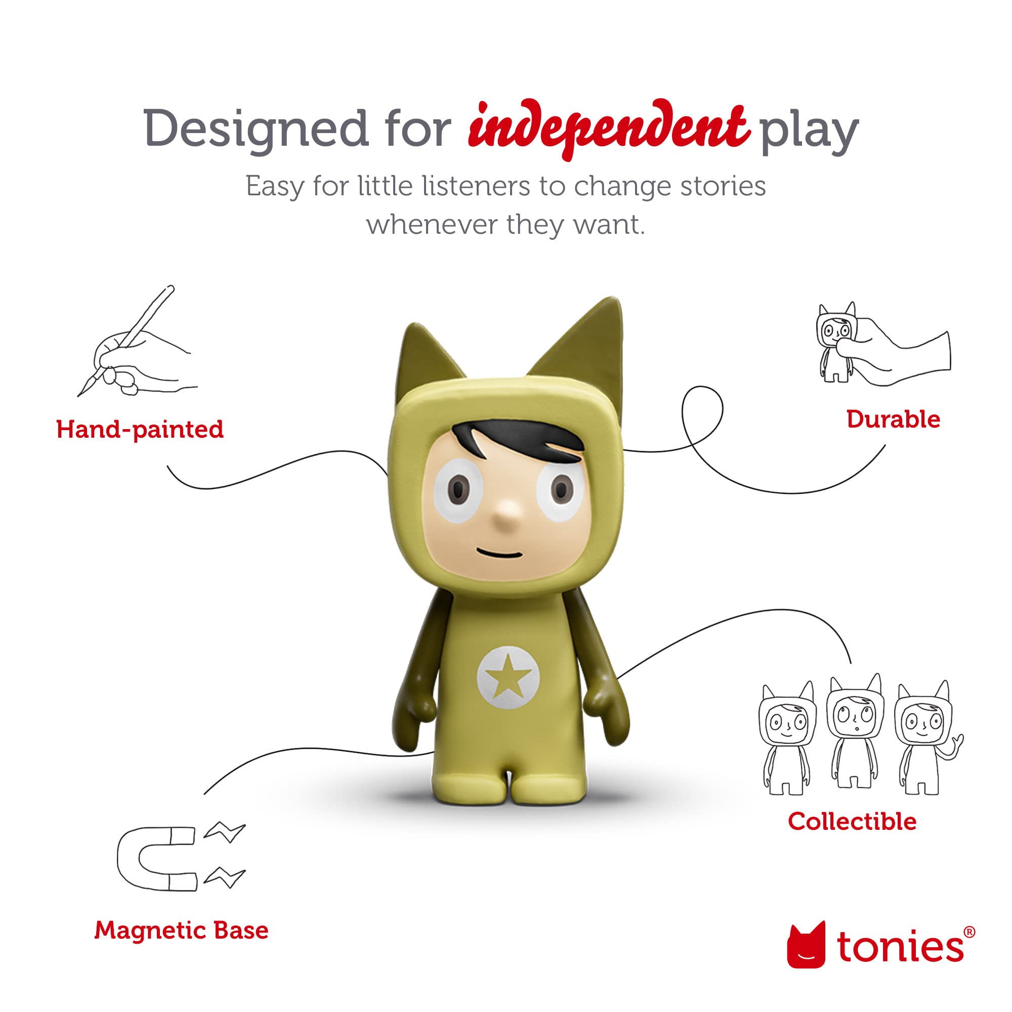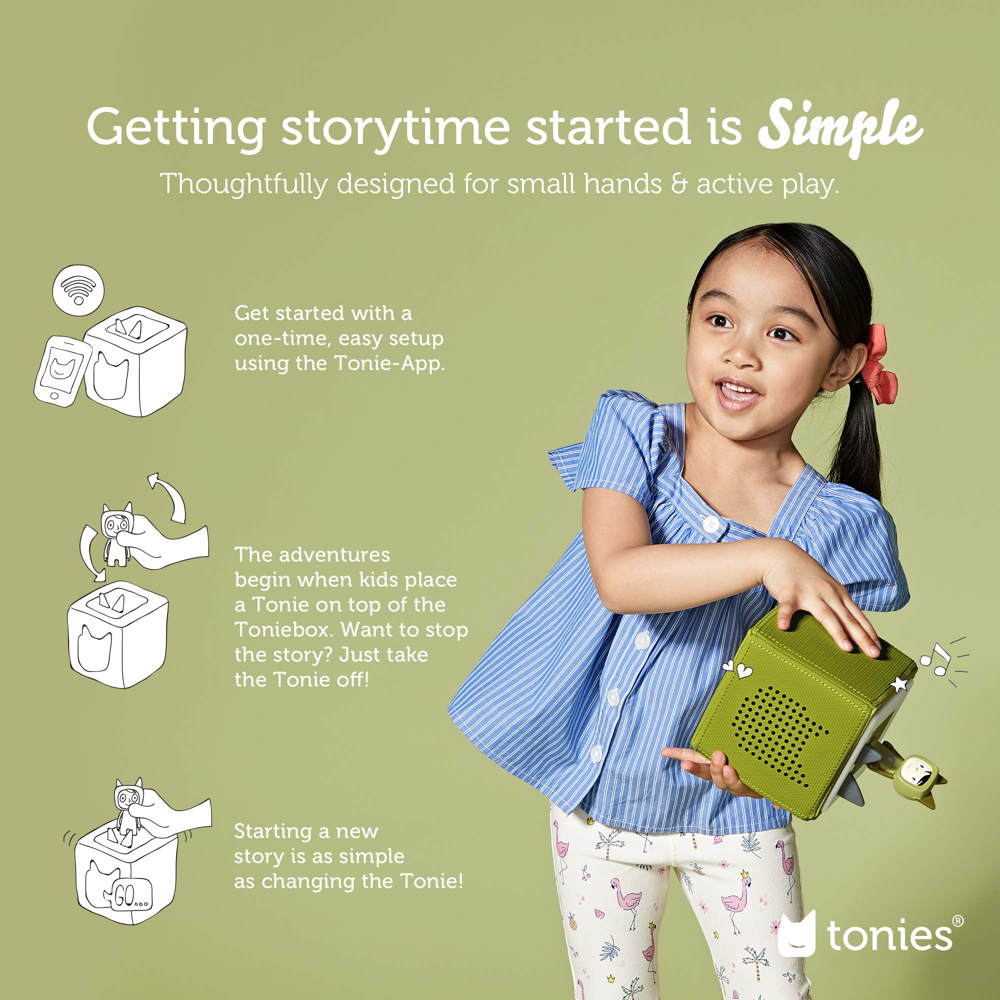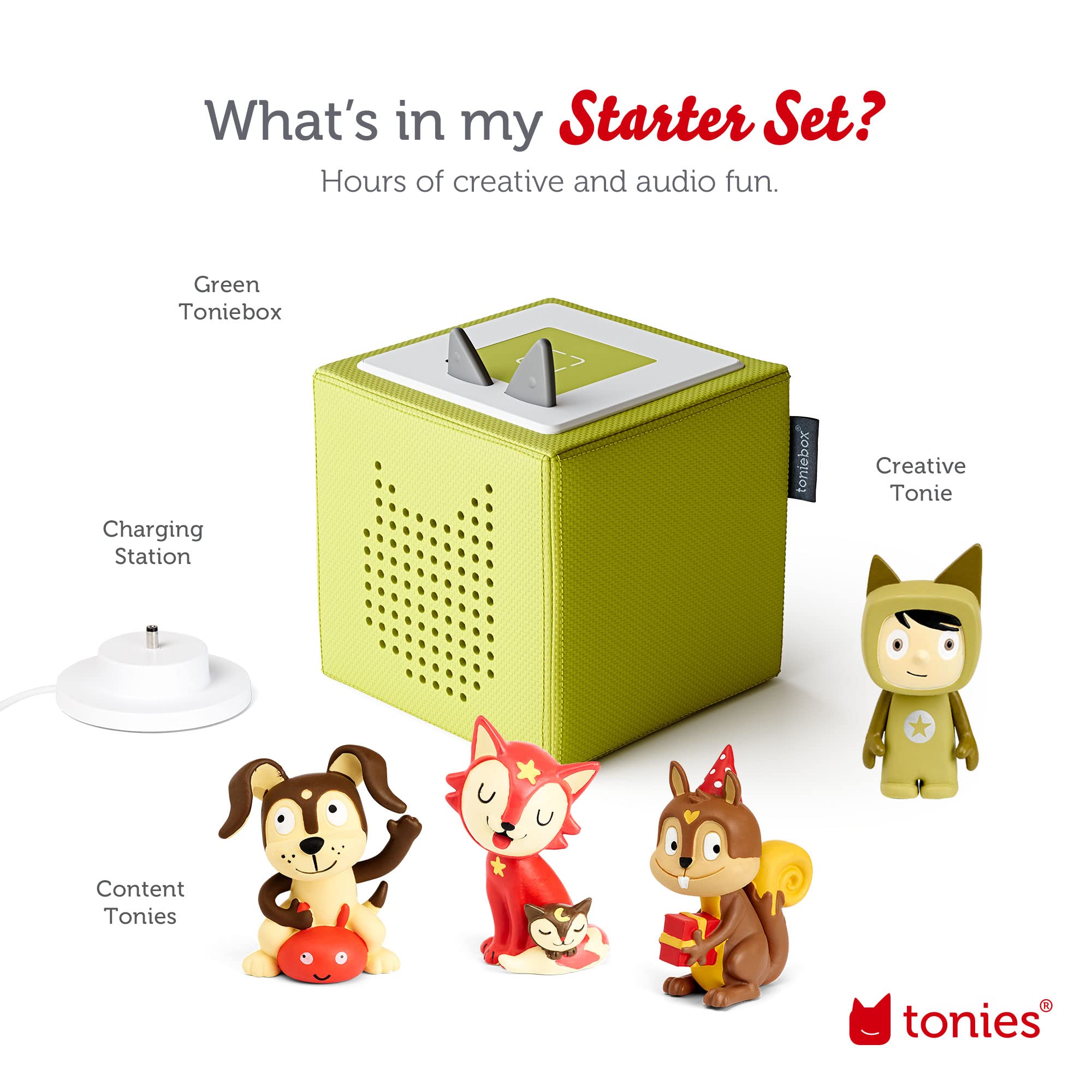- Bundle includes a green Toniebox, charging station, a Creative Tonie, Playtime Puppy, Bedtime Songs, and Celebration Songs. Additional Tonies can be purchased separately.