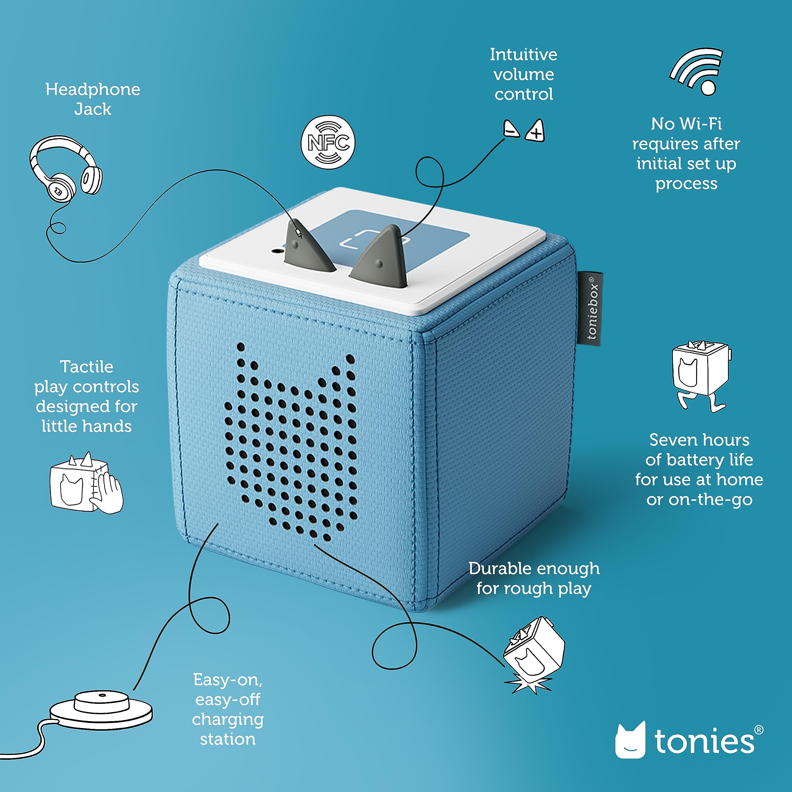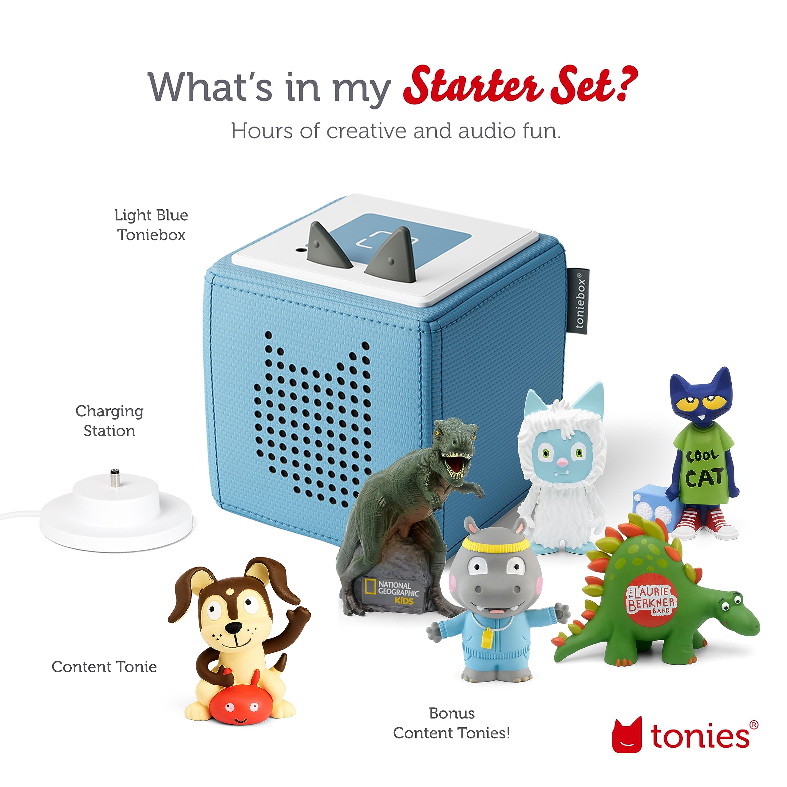 - Bundle includes a red Toniebox, charging station, Playtime Puppy, Pete the Cat, Healthy Habits, Laurie Berkner, National Geographic Dinosaur Tonies, and Yeti Creative-Tonie. Additional Tonies can be purchased separately.