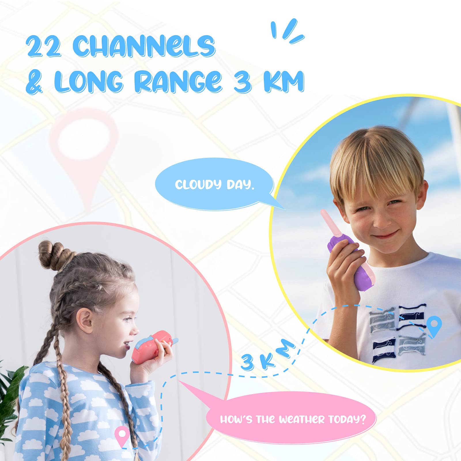 - u3010Clear Sound, Strong Signal, Long Rangeu3011This walkie talkies for kids had built-in high quality crisp for smooth sound quality and with strong signal in long distance connection (up to 3km). Perfect for outdoor adventures, like hiking, camping, cycling, gaming, etc
