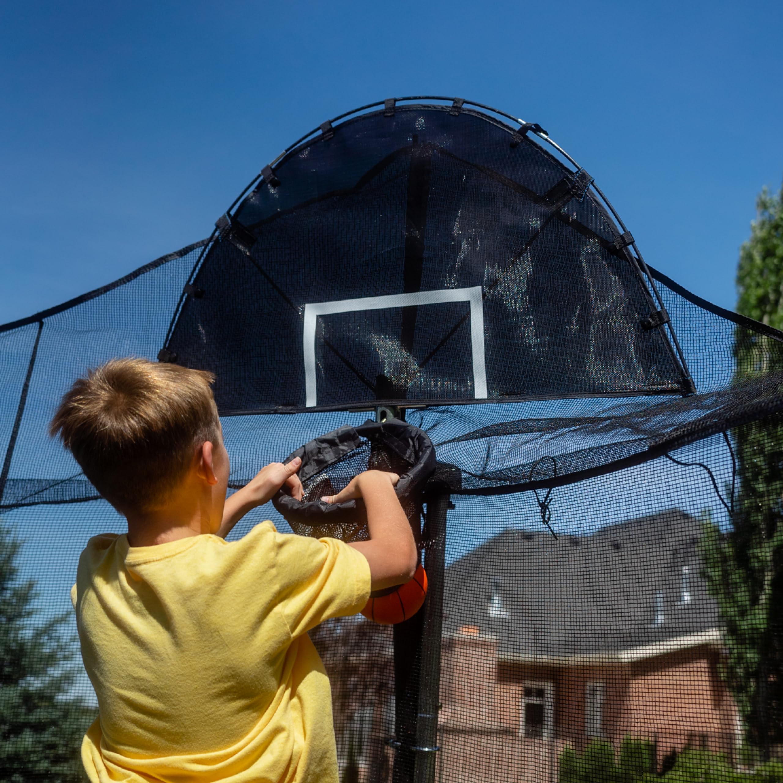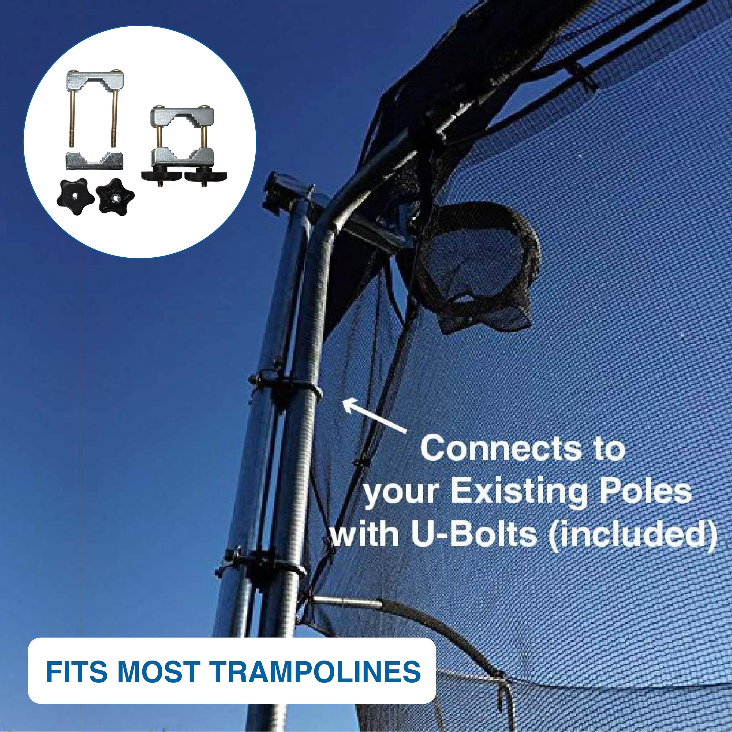 - u2714 FIT & INSTALL - The Slammer will fit most trampoline models using the included hardware. It attaches to the outside of your trampoline enclosure pole, and sits over the top of your trampoline net. This means the hardware is safely outside of the trampoline, while the backboard and rim are accessible for play