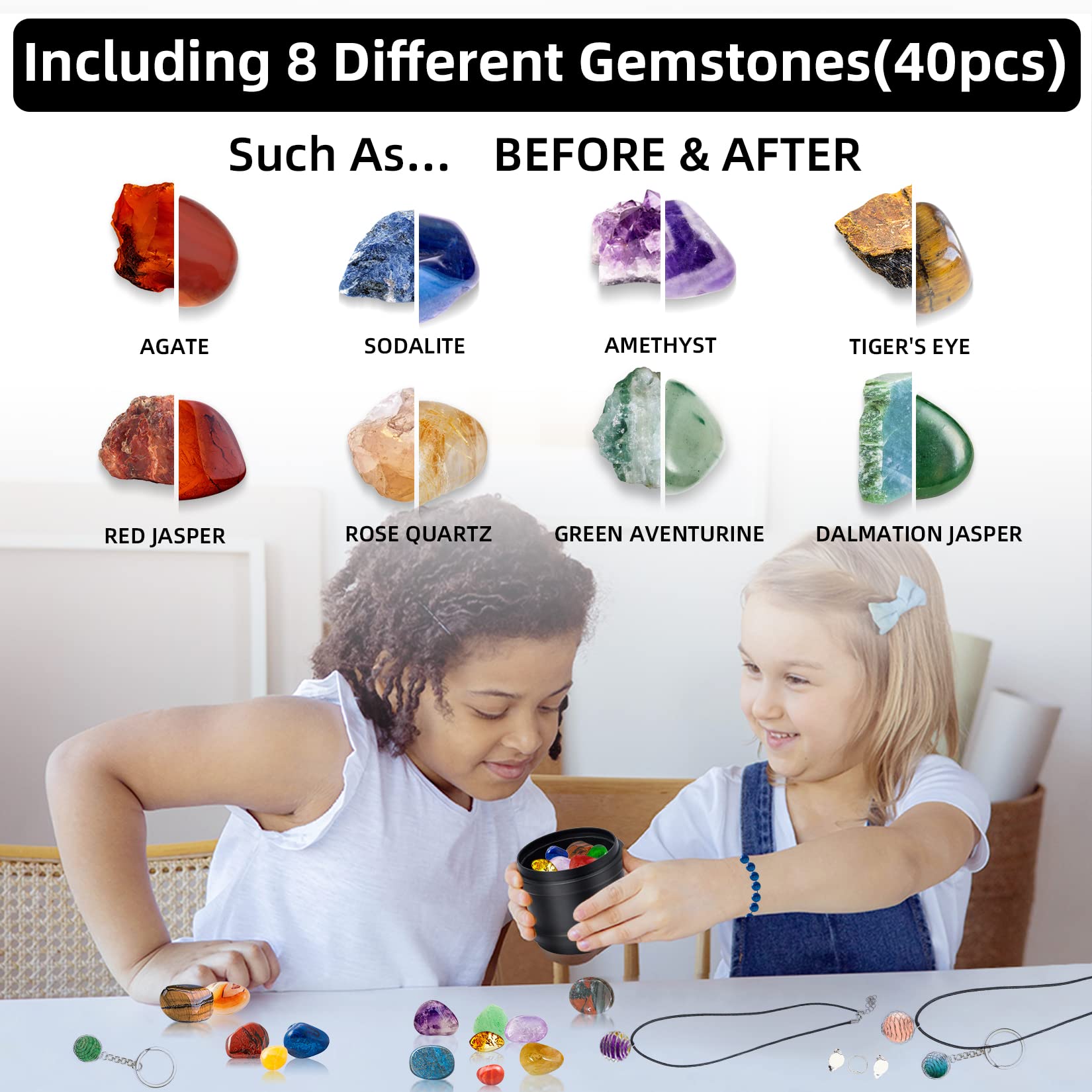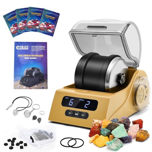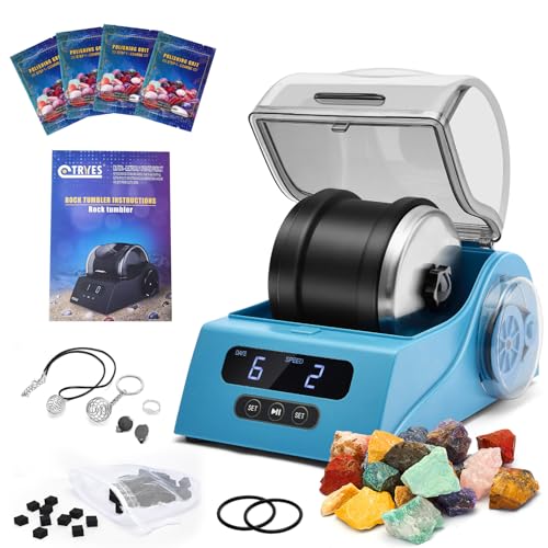 - [Rock Tumbler Kit] - The rock tumbler set comes with everything you need, including, 1 Rock Tumbler, 2 Bags of Rough Gemstones, 4 Polishing Grits, 2 Polishing Sponge Blocks, 1 Filter, 1 set Jewelry Setting (placed in the barrel) 1 Power Adapter and a detailed learning guide. A Perfect gift for adults and Kids!