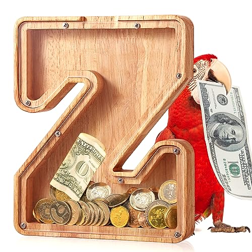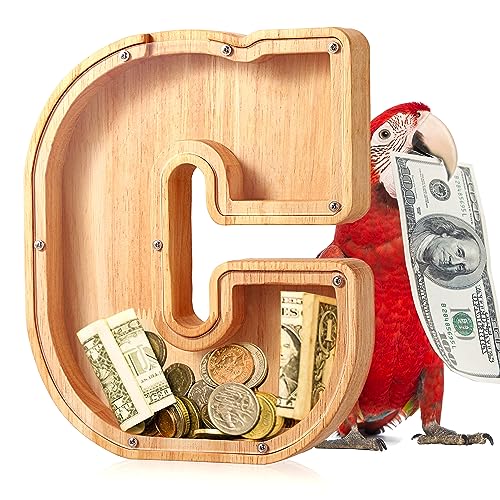 - u2764u3010EDUCATIONAL TOYu3011 Piggy-bank for kids comes with delicate PVC upper and lower case letter stickers that kids can use to DIY their own name on the acrylic transparent board. With a size of 9.1 inches, this large wooden piggy bank can collect coins and cash while improving your child's numeracy skills and providing interactive fun with friends or family.