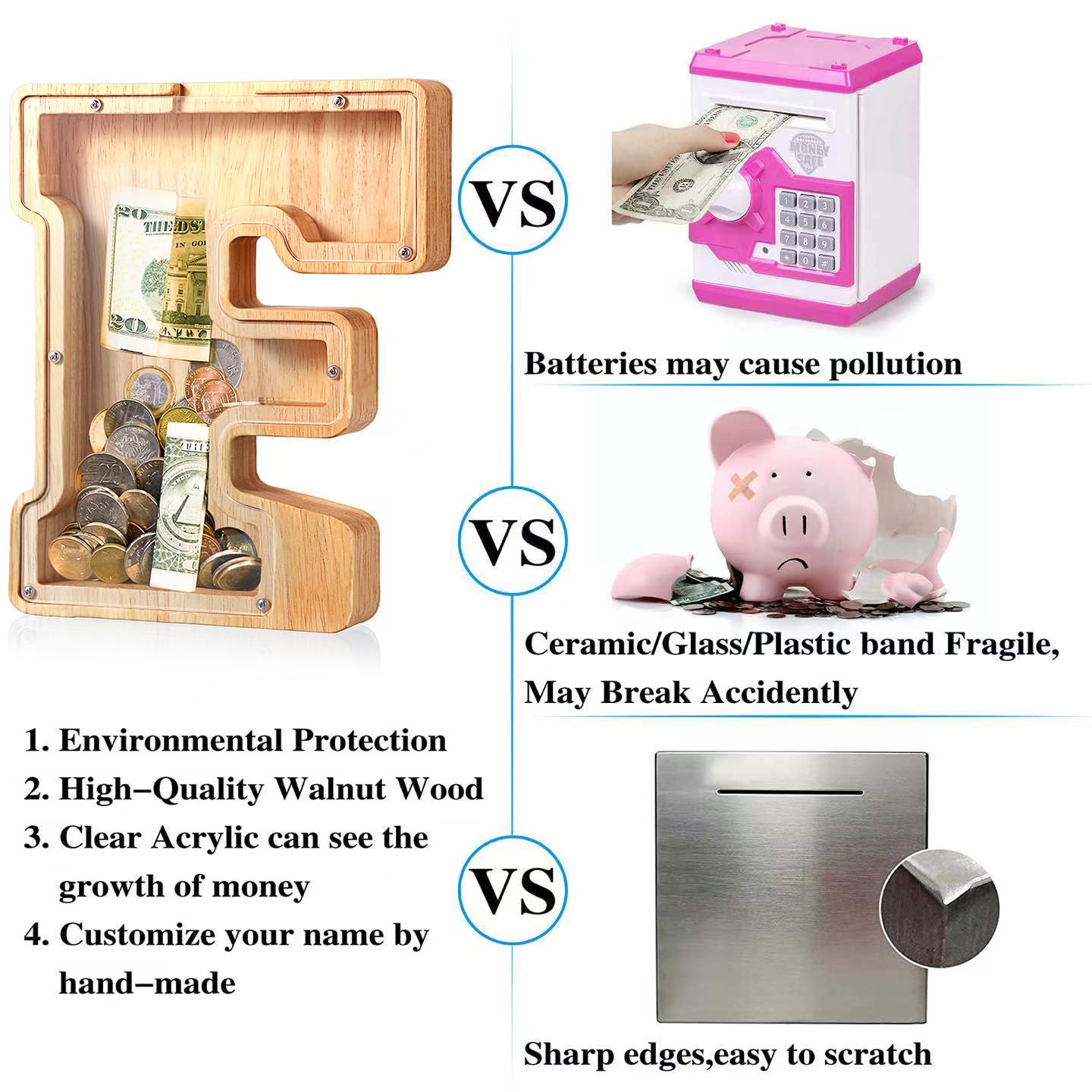 - u2764u3010PERSONALIZED PIGGY BANKu3011 This piggy bank boalord is different from others because it is handmade from natural wood. It is environmentally friendly, safe, and offers great value and durability. A fun and educational toy for kids, they can observe their savings grow through the transparent acrylic surface.