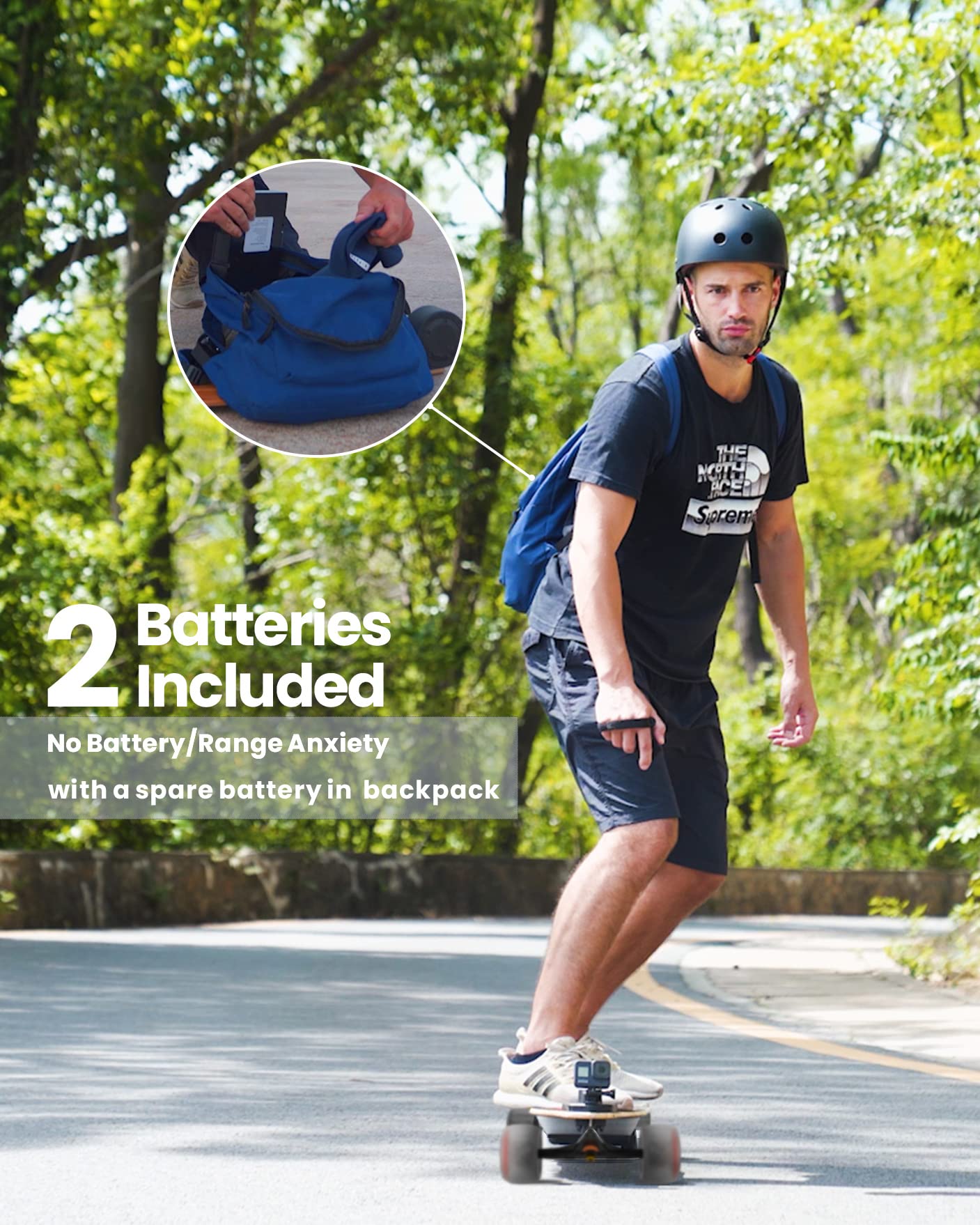 - [10 seconds to Replace the Battery]: Allowing you to skate while the backup battery charges separately. Renew the lifespan of the e-board by replacing the battery, without having to spend hundreds of dollars on a new one just because the battery has reached the end of its life.