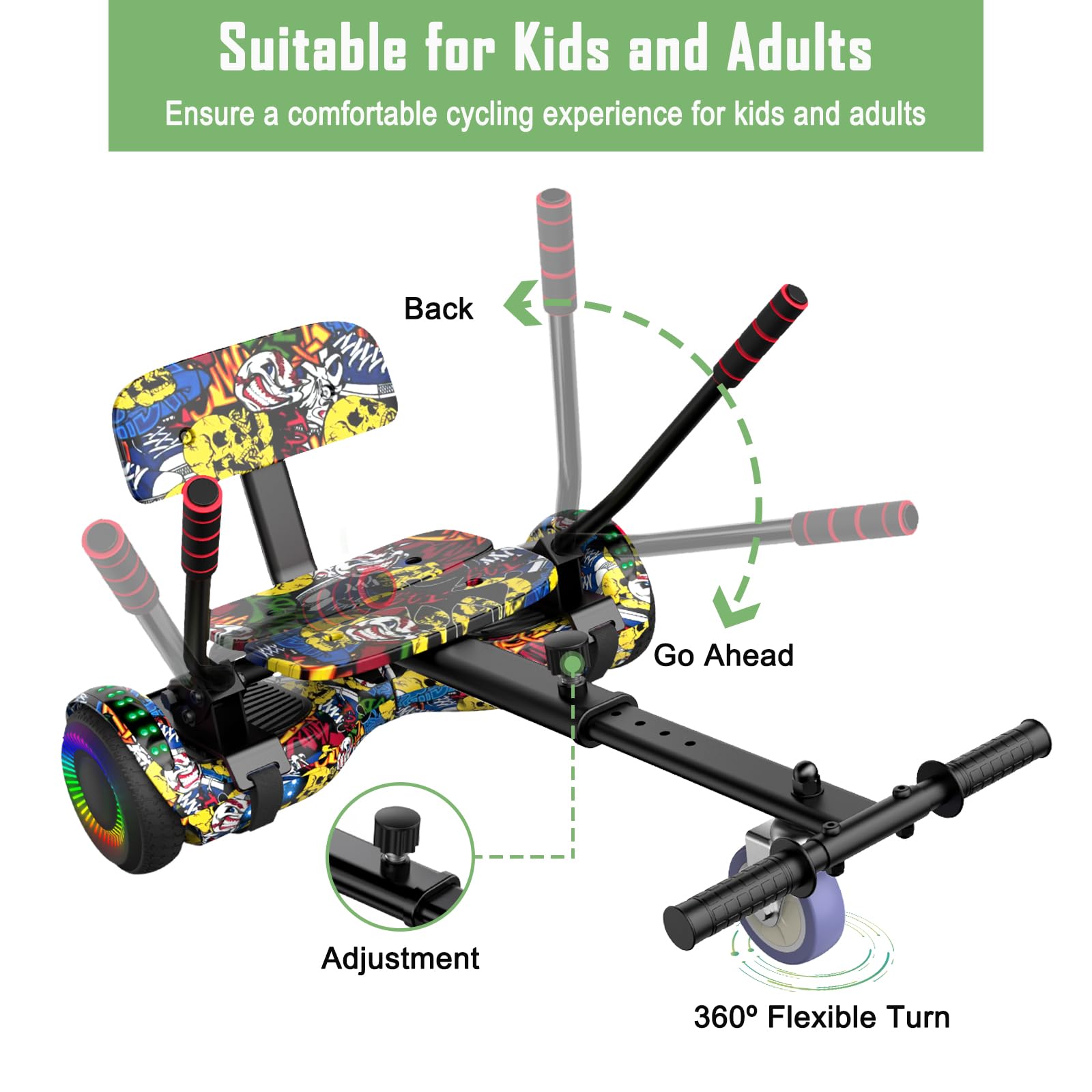 - u25b6u25b6Match with Comfortable Hoverboard Kart Seat : Safe and comfortable driving with great fun factor. Seat expansion makes the self balance scooter very mobile and fast. Adjustable length from 72cm to 85cm, a hoverboard with seat very suitable for kids and adults.
