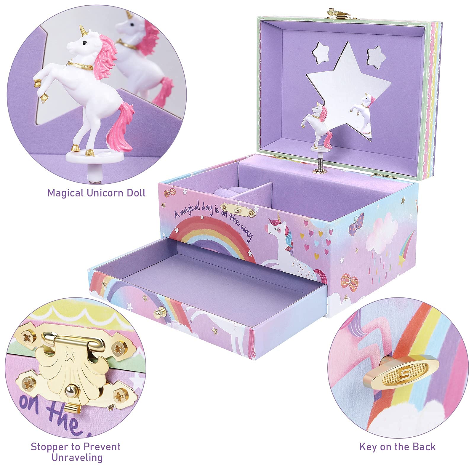 - High-quality Musical Box - Made with pine fiberboard material and covered with rainbow unicorn watercolors painting. The heart of the musical box is a special silver-plated iron mechanism that will keep the tune rolling for years to come. When you receive the product, if you are not satisfied with our products, contact us any time, we will get you back within 24 hours try our best to make things right. We just hope you have a pleasant shopping!