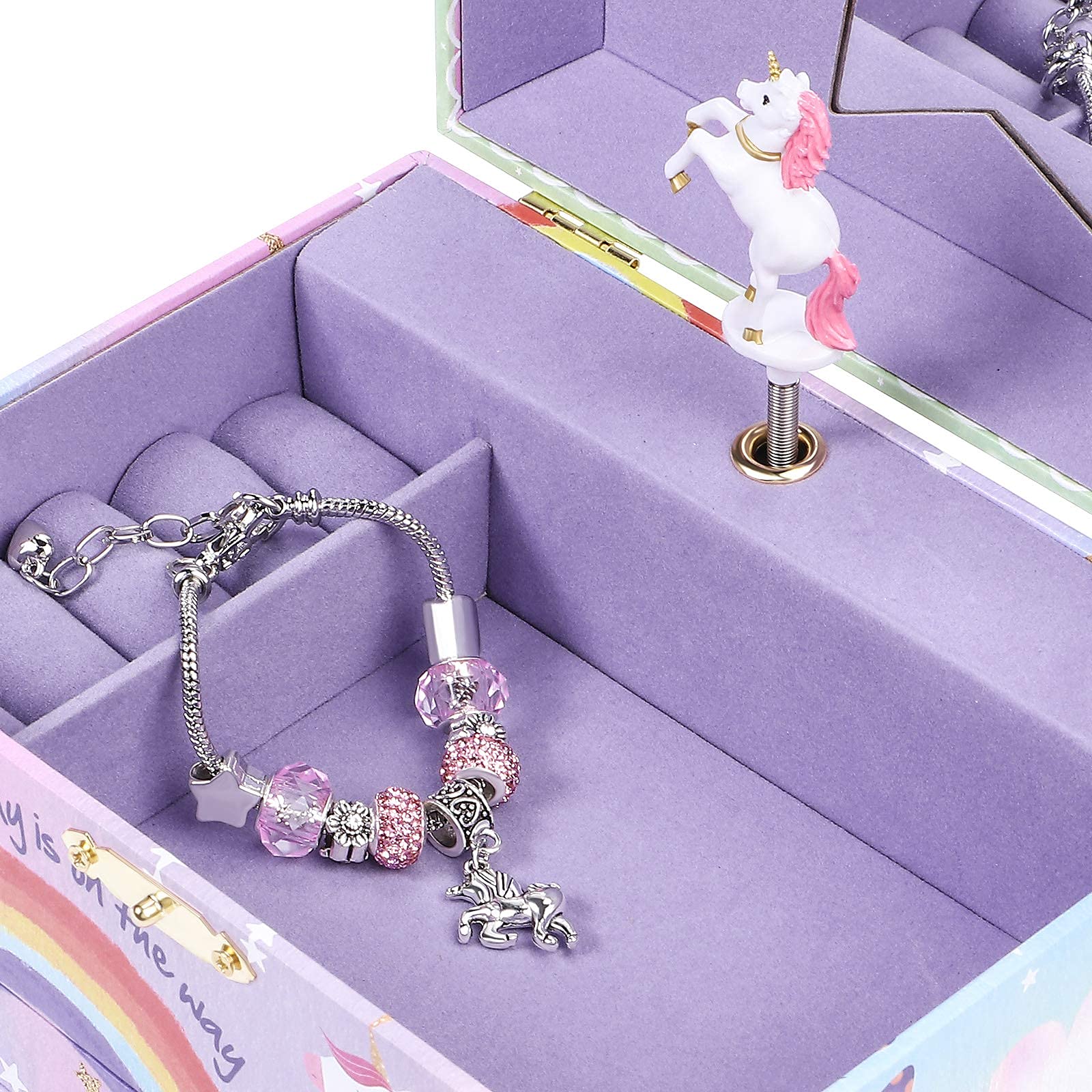 - Best Classic Kids Jewelry Box - The only thing better than a unicorn jewelry box is a box that plays music and includes a crystal charm braceletu2014which is exactly what this is. The box, which is covered in magical designs and doodles, opens to a small unicorn figurine that twirls to the tune of, well, u201cThe Unicorn.u201d Music box measures: 7.15 x 5.25 x 4 inches (L x W x H) when closed.