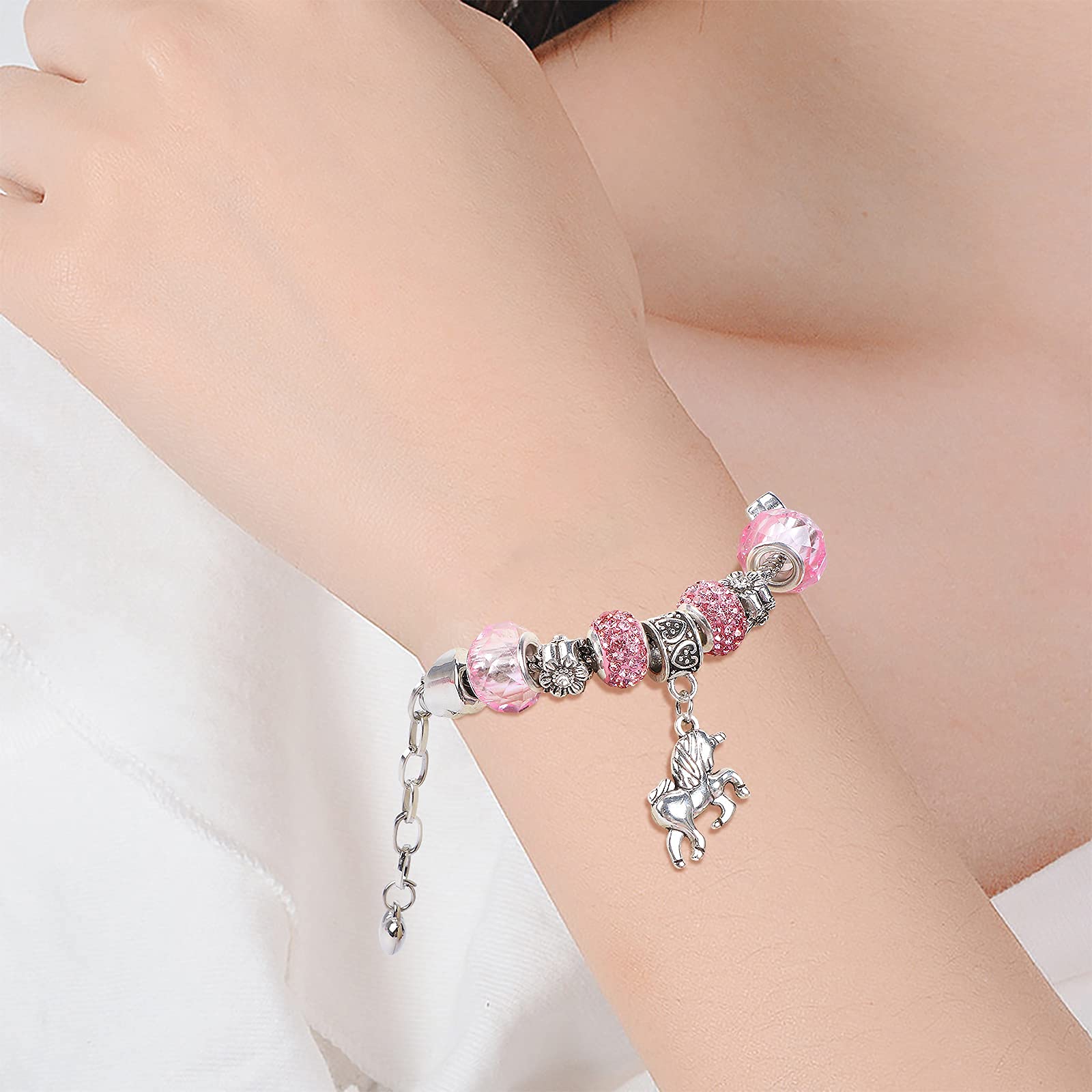 - Sparkly Pink Crystal Unicorn Bracelet - Set your heart a-flutter with this romantic version of the unicorn charm bracelet. The sterling silver snake chain bracelet hand-finished with a unicorn pendant looks stunning on its own but even better adorned with your favorite jewelry. Change the beads combinations to create one-of-a-kind bracelets. It encourages creativity and self-expression.
