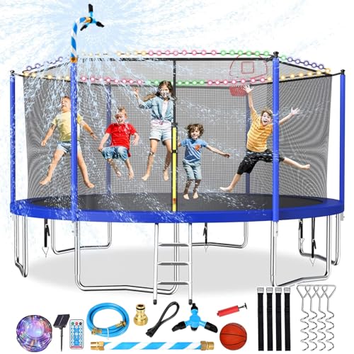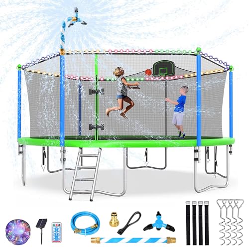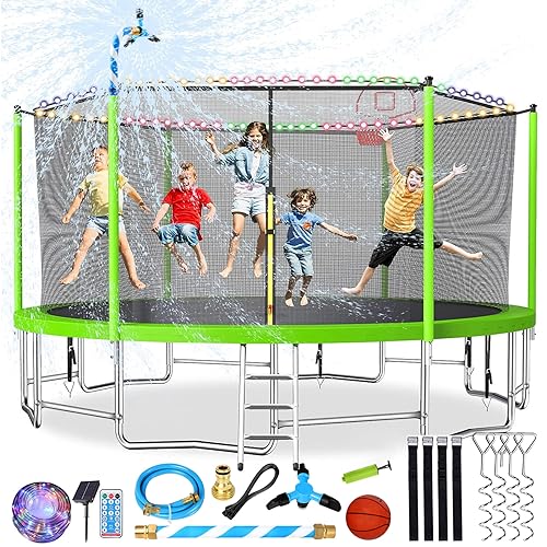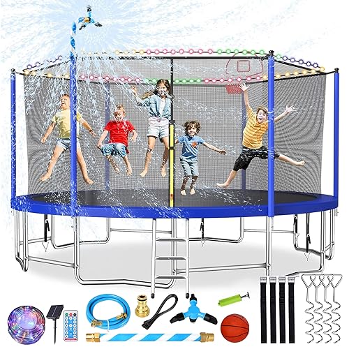 - u3010Trampoline Accessories Outfitsu3011Our large 16ft trampoline for kids and adults comes with a whole set of accessories which includes: 4 ground stakes, 1 trampoline sprinkler, 1 led light. Bonus packs bring your kids endless giggles
