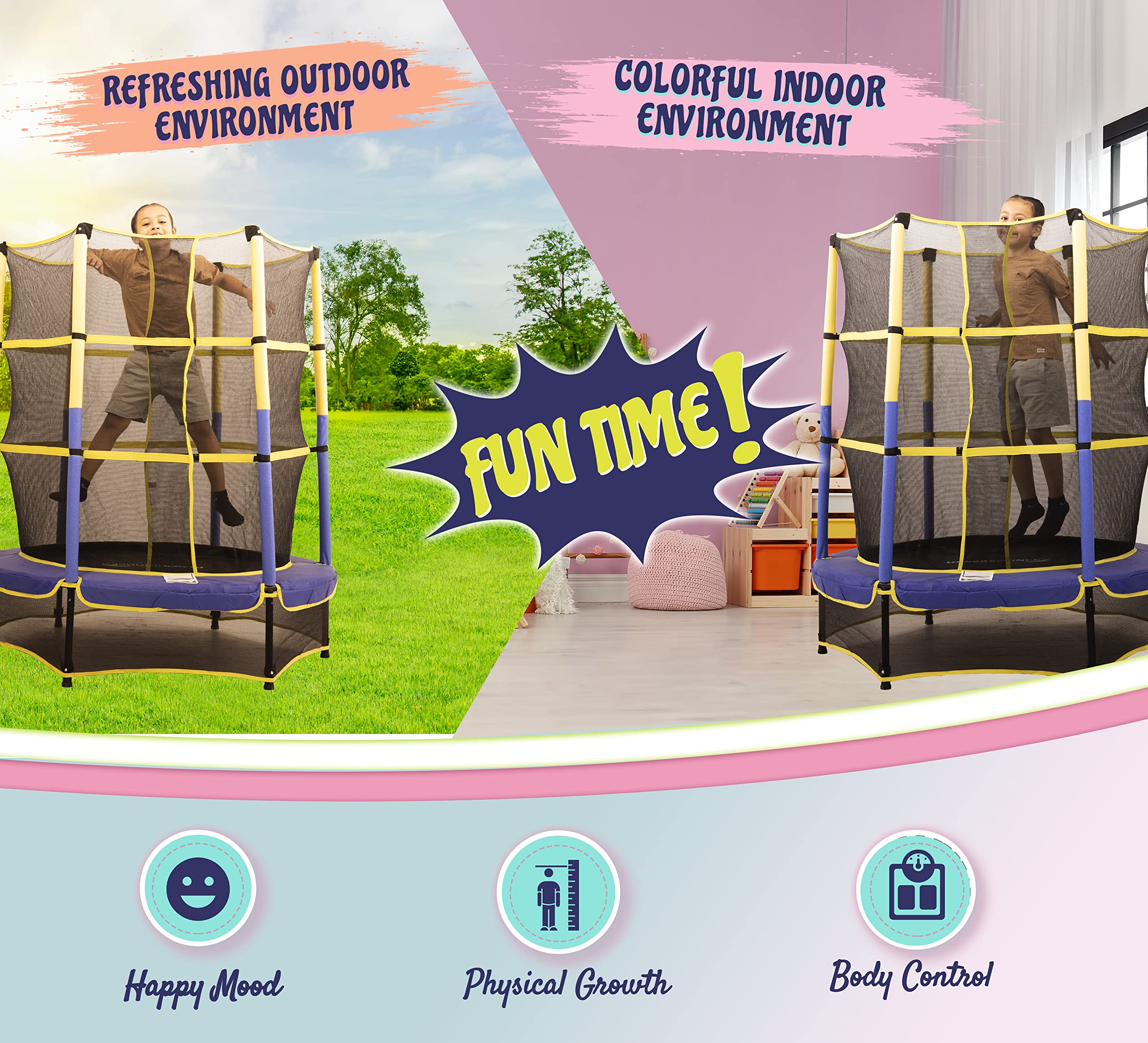 - Safe and Sturdy Trampoline: The support poles are covered with anti-collision foam, creating a safe play environment inside the baby/child trampoline. The toddler trampoline with net features a gap-free enclosure design to ensure kids' safety when jumping. Safety pads contain closed-cell foam that is highly durable and does not get out of shape. The child trampoline has 6 supportive and stable anti-skid legs that maintain the kid's equilibrium while doing body movements