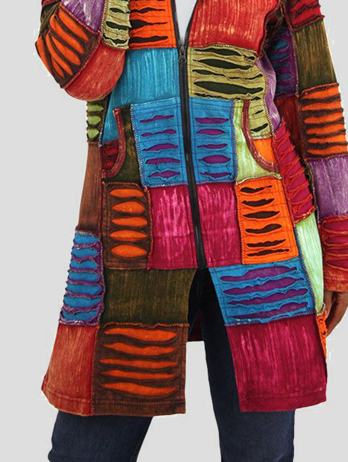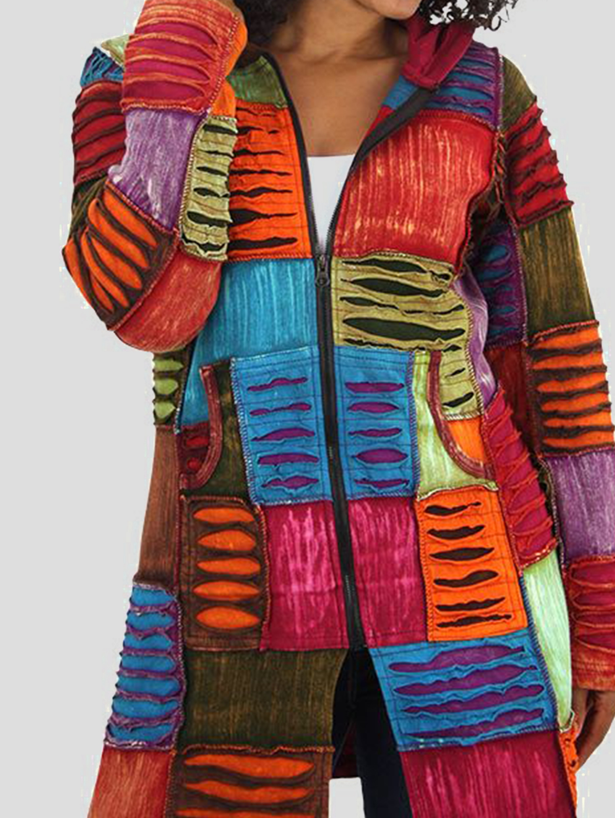 Ursime Fashion Colorblock Patchwork Ripped Ruffle Long Sleeve Zipper Hooded Jacket