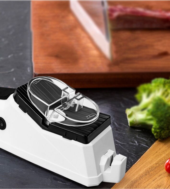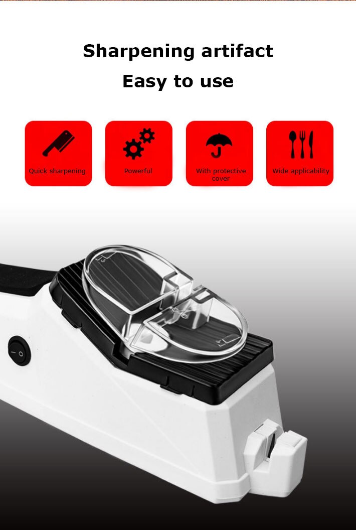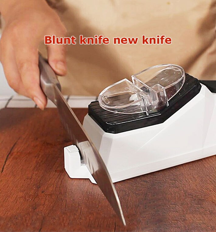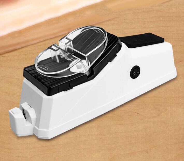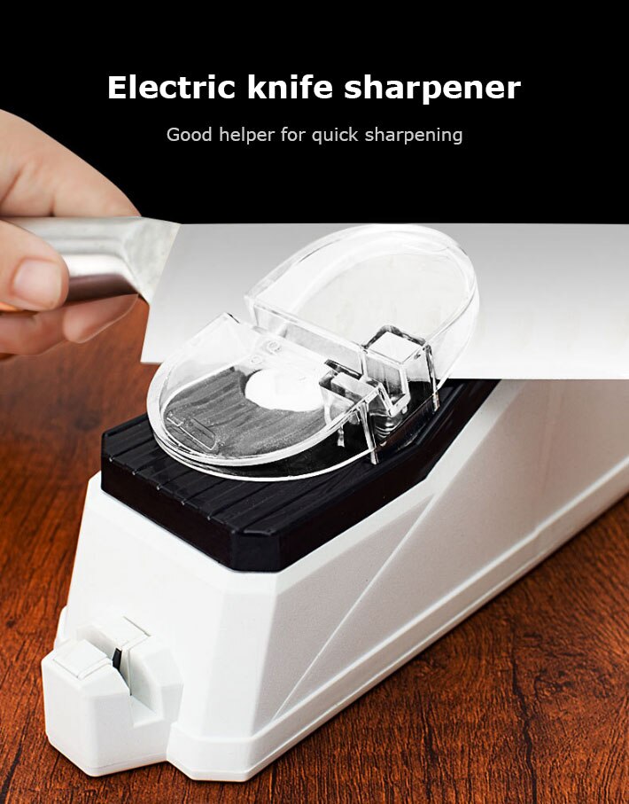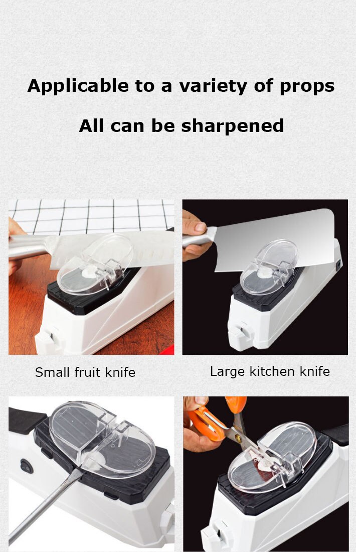Name: Electric Sharpener Product color: gray + white Material: PP+ grinding wheel Product specifications: USB models Product advantages: sharp knife in seconds, sharp blade Product application: all kinds of knives, scissors, etc. Use environment: family, restaurant Packing method: tightly packed