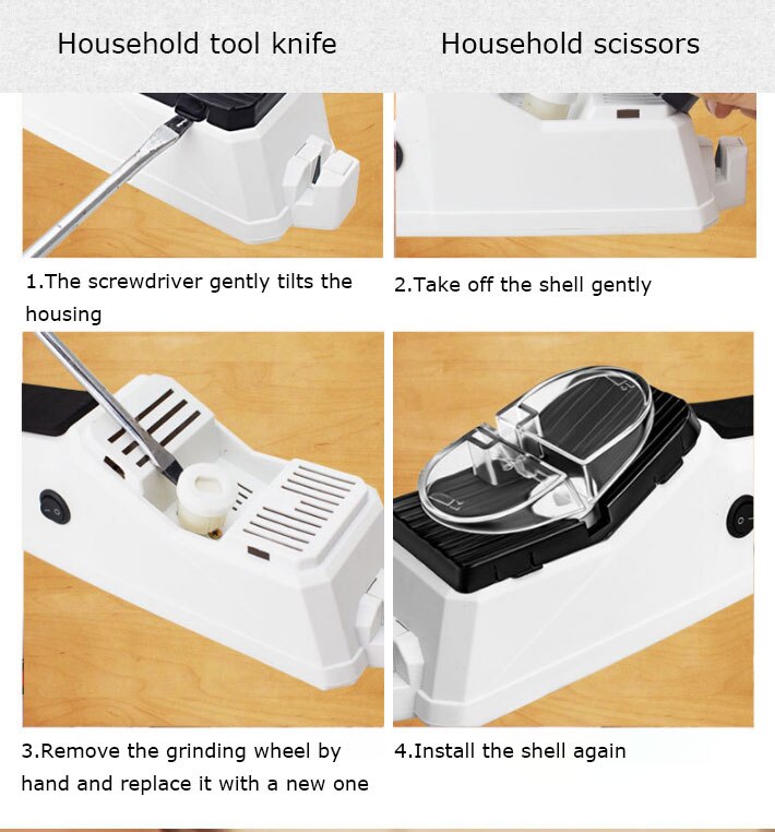 1. The screwdriver gently upturns the shell; 2. Take off the shell gently; 3. Remove the grinding wheel by hand and replace it with a new one; 4. Install the shell again