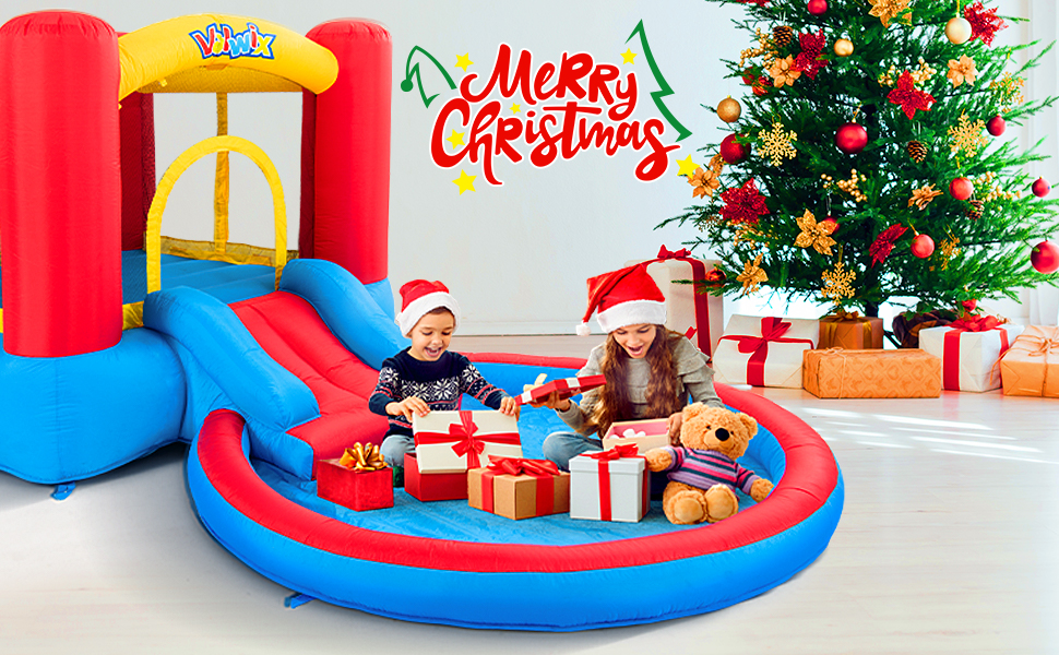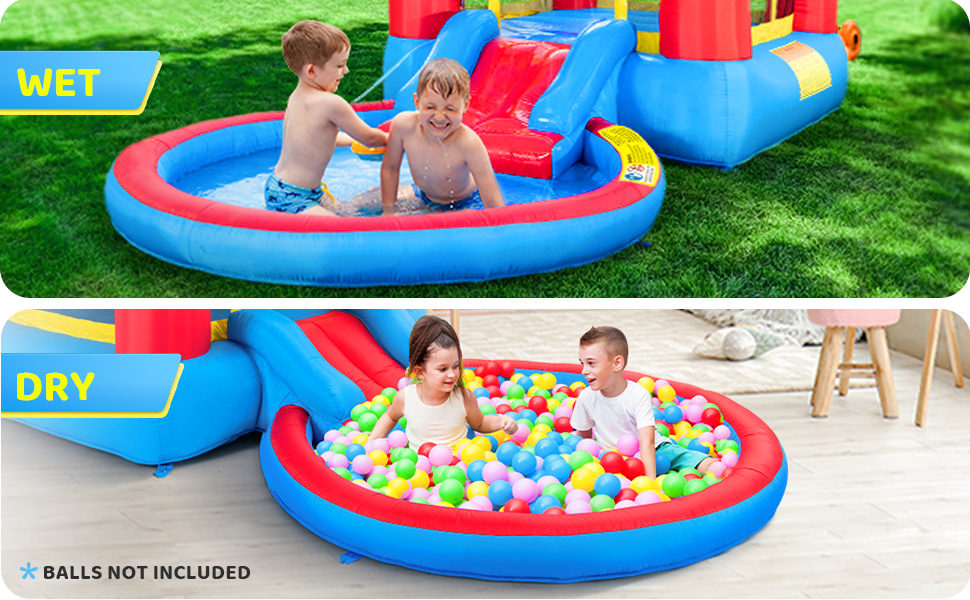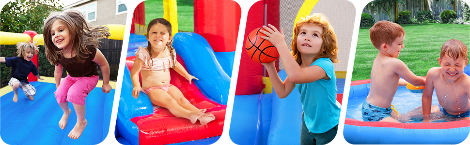 • u3010Water World in Summeru3011 Bounce & water slide combo allows family to turn the backyard into a private mini water park. Kids can whoosh into the refreshing down pool thanks to the sprinkler system which keeps the slide wet all the time. It encourages kids to slide and splash together to enhance social and emotional abilities. From birthday parties to outdoor carnivals, fairs, or even unstructured playtime, inflatable bounce house can be re-used over and over again.