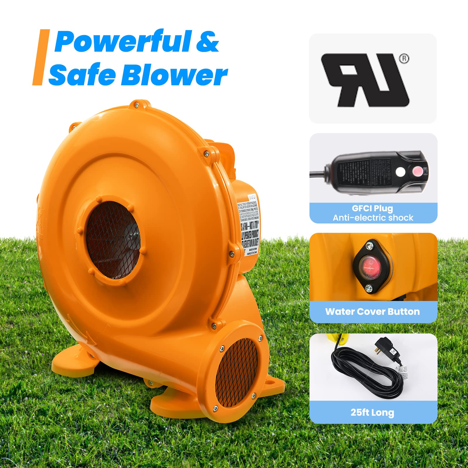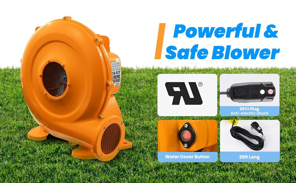 - u3010Laser Focus on Safetyu3011 A heavy-duty blower with a GFCI plug will shut off under unsafe conditions to prevent kids from faulty shock. Ground stakes keep bounce house firmly fixed without shaking. A finger-safe netting allows kids to have plenty of space to tumble around without falling off. Valwix playhouse gives you the peace of mind that your kids always play in a structure with premium safety design.