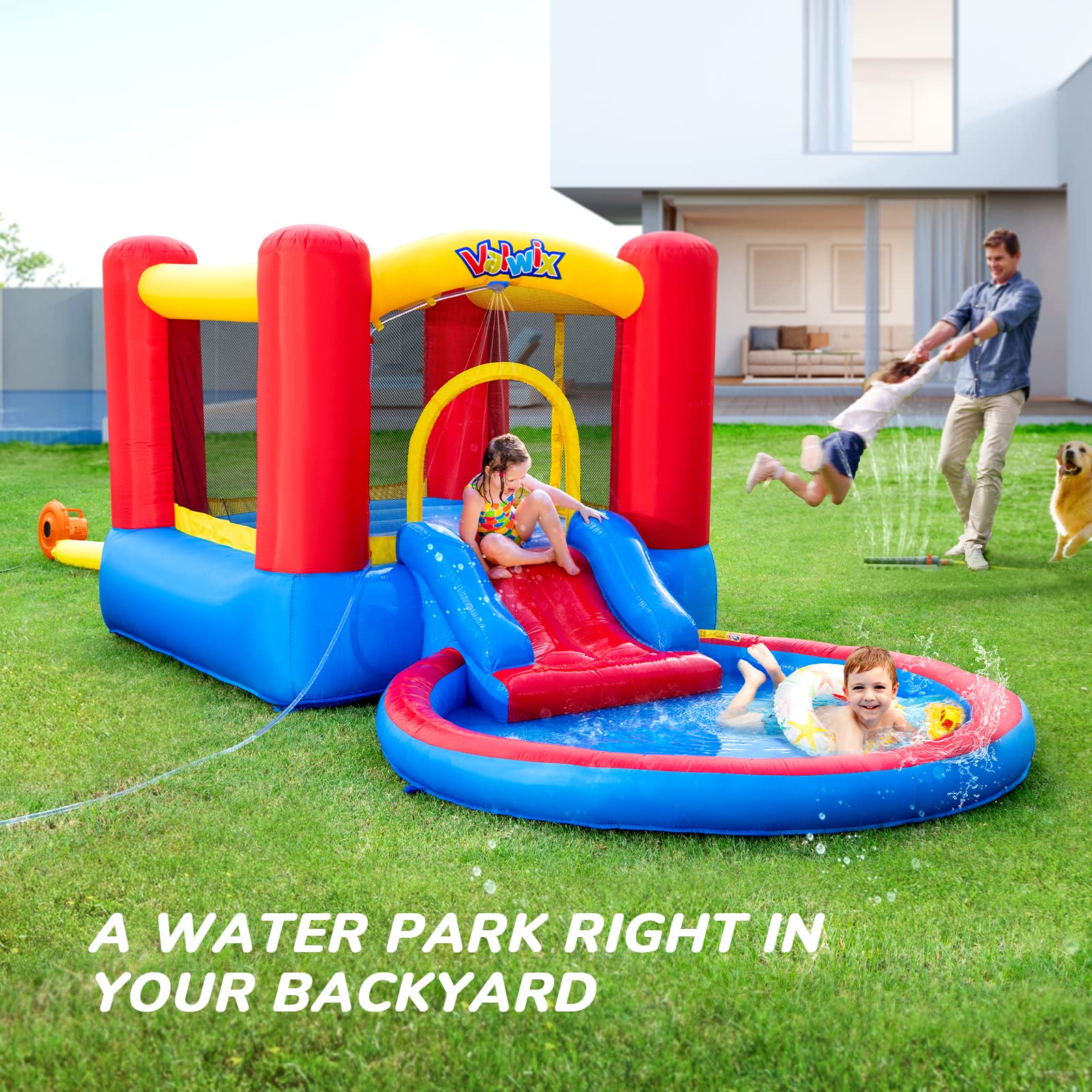 - u3010Water World in Summeru3011 Bounce & water slide combo allows family to turn the backyard into a private mini water park. Kids can whoosh into the refreshing down pool thanks to the sprinkler system which keeps the slide wet all the time. It encourages kids to slide and splash together to enhance social and emotional abilities. From birthday parties to outdoor carnivals, fairs, or even unstructured playtime, inflatable bounce house can be re-used over and over again.
