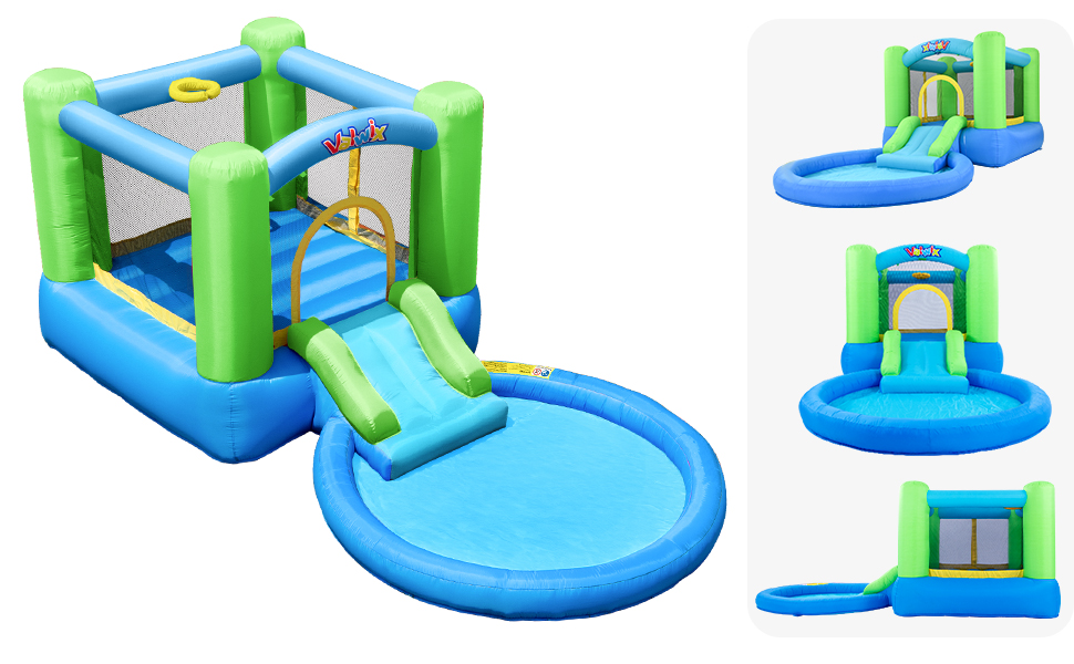 • u3010Water World in Summeru3011 Bounce & water slide combo allows family to turn the backyard into a private mini water park. Kids can whoosh into the refreshing down pool thanks to the sprinkler system which keeps the slide wet all the time. It encourages kids to slide and splash together to enhance social and emotional abilities. From birthday parties to outdoor carnivals, fairs, or even unstructured playtime, inflatable bounce house can be re-used over and over again.