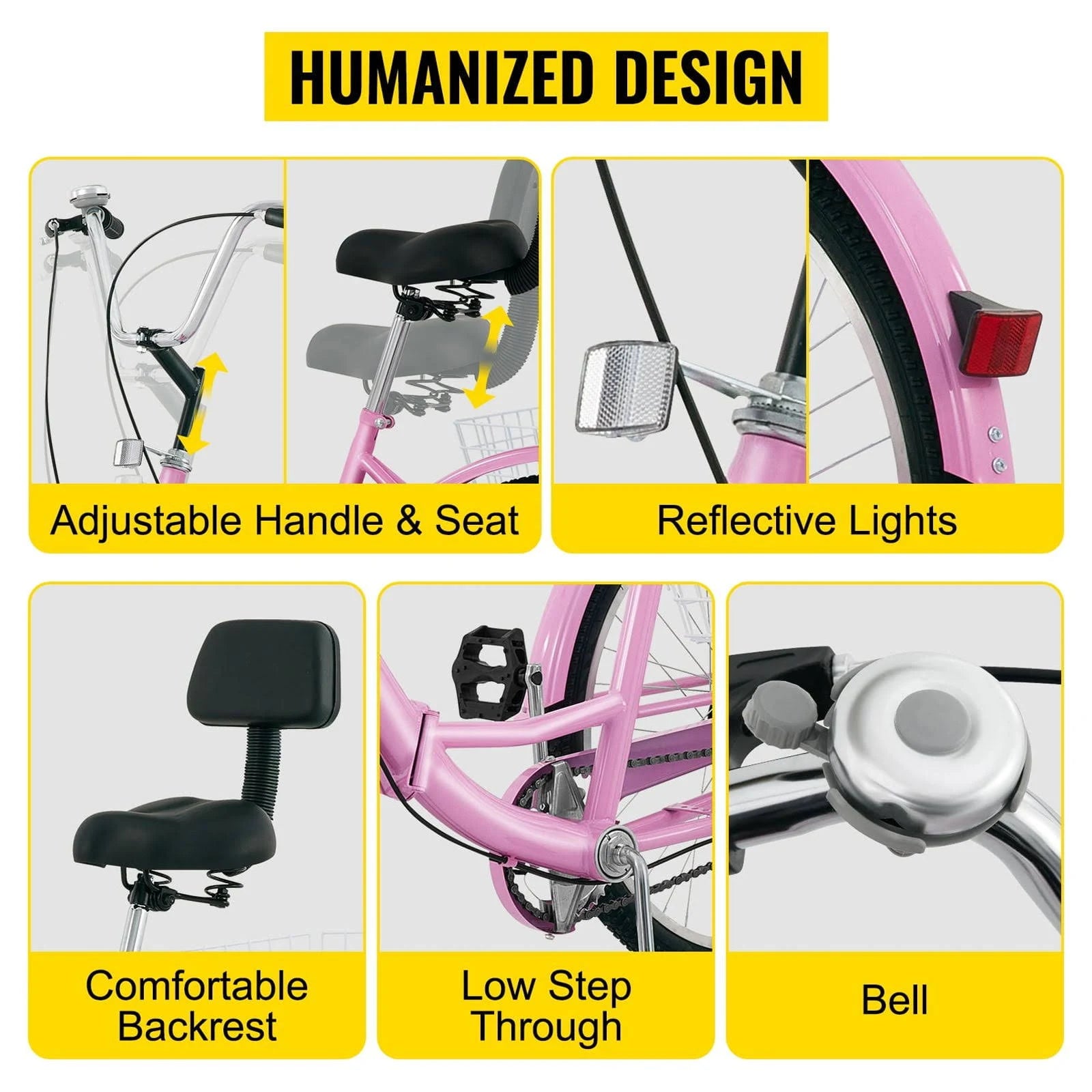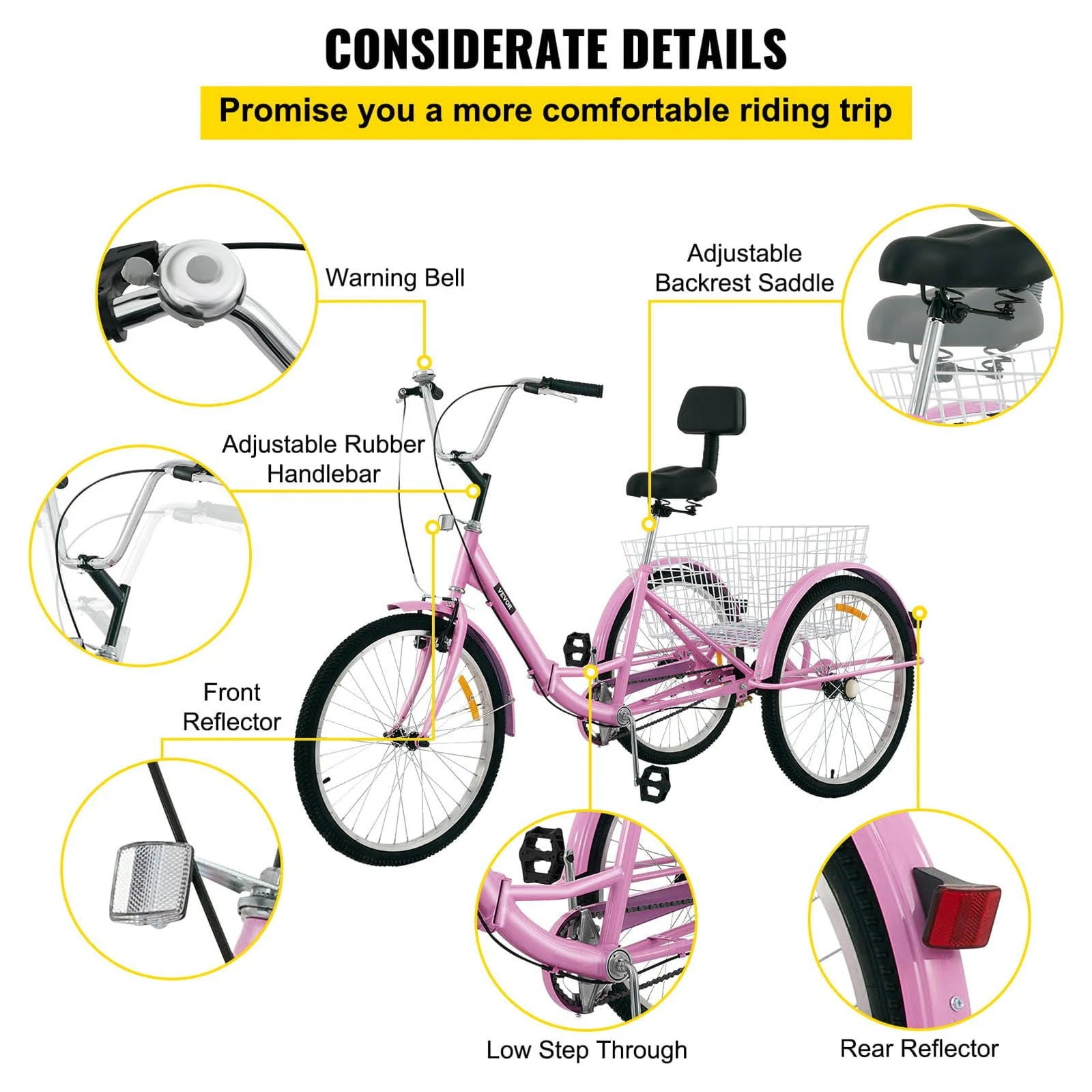 Product Description Foldable Adult Tricycle This bicycle is designed to be durable with large load capacity. Great for daily use or work. The 3-wheel frame is safe and stable on any road conditions. Perfect for adults, especially elders.Warm RemindeAfter receiving, the bicycle shall be installed by yourself Durable Carbon Steel The sturdy carbon-steel frame provides firm support up to 330 lbs/150 kg for the rider and goods. A protective coating makes this adult folding tricycle an excellent choice, putting your mind at ease by avoiding corrosion, rust, and scratches. Foldable & Space-Saving You can fold this adult tricycle effortlessly with a quick-release buckle. This thoughtful design saves space during transport, parking, and storage. Therefore, the trike is always with you and ready to go. Front and Rear Brakes This folding tricycle adult has front and rear brakes working together for more secure riding. The sensitive dual braking system also promises more stopping power to assist you in an emergency Designed with You in Mind You're sure to have a comfortable ride with our fully adjustable backrest seat and easy-grip handles. The bell and reflective lights provide extra protection on the road, while the low step allows easy access. Practical Large Basket Our 3 wheel bicycle is equipped with a 2.8 cubic feet basket to carry groceries, office supplies, weekend picnic essentials, or well-loved pets. So you no longer need to worry about running out of room while riding. Enjoy Anywhere This 3 wheel bike for adults is a practical tool for entertainment, shopping, outings, picnics, or exercising. You can enjoy a leisurely ride around town, along the country roads, or follow the coast Specifications Model: 24IN-1S-PINK Material: High-Carbon Steel Load Capacity: 330 lbs/150 kg (rider and cargo combined) Basket Capacity: 2.8 cubic feet/79 L