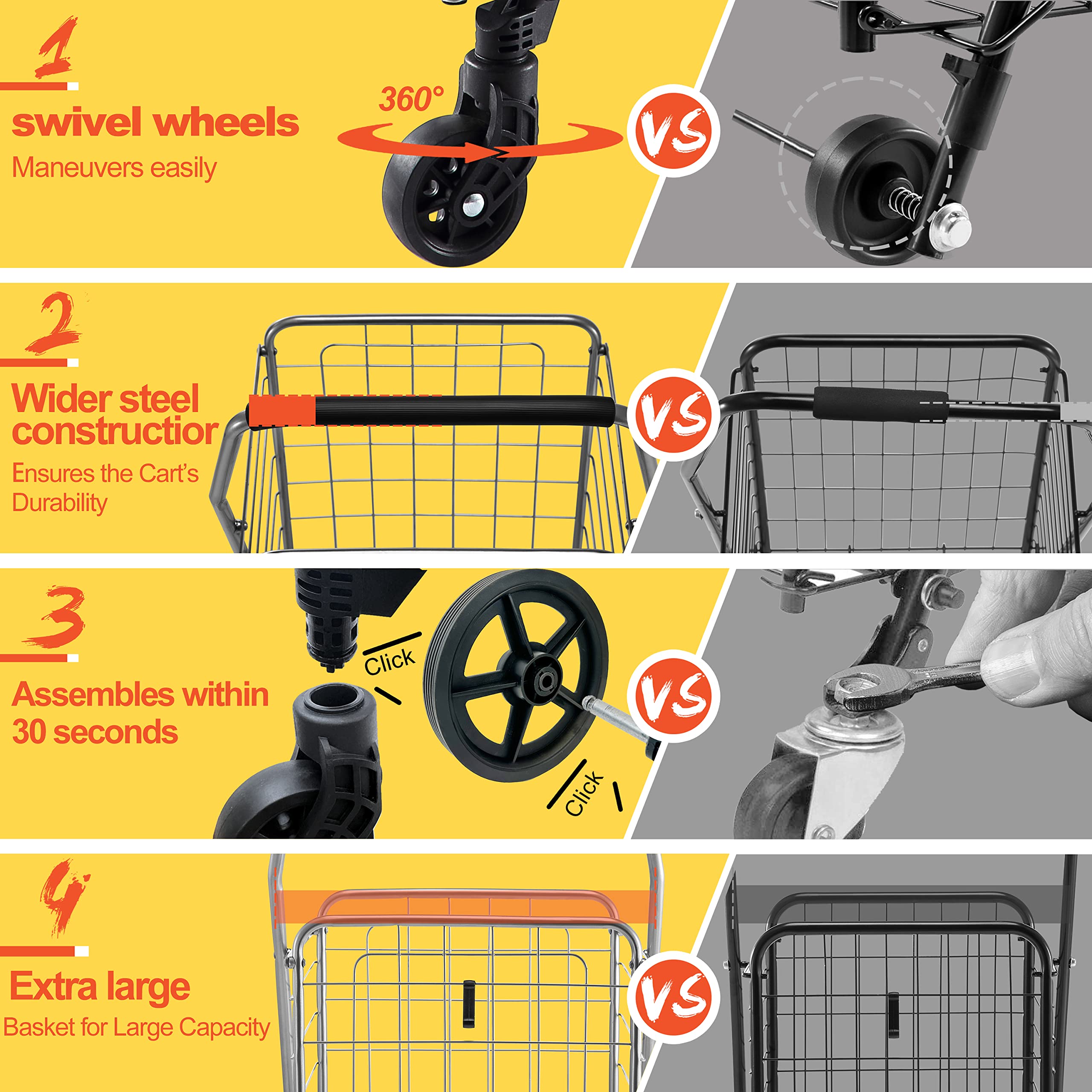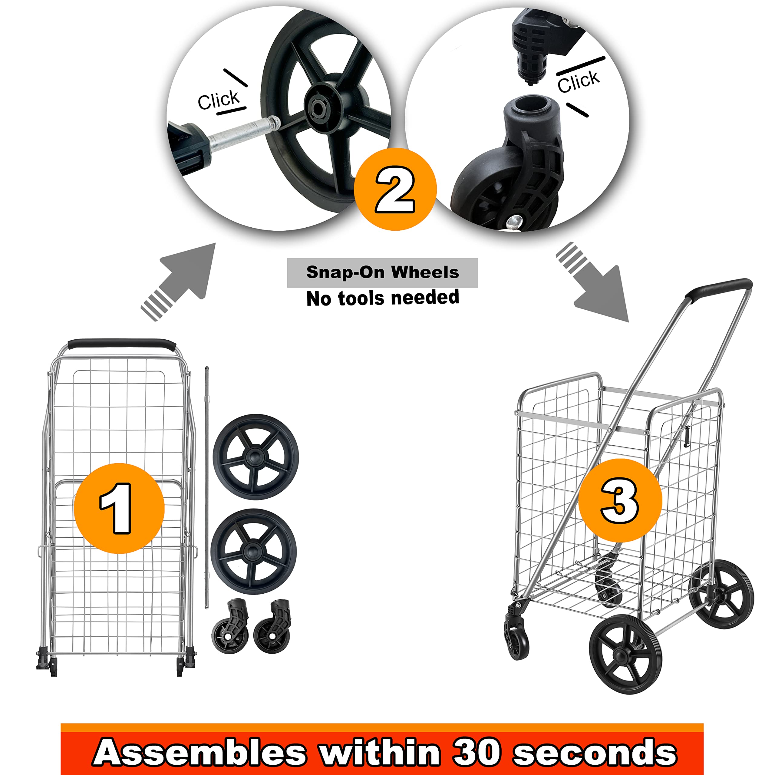 - OPTIMAL MANEUVERABILITY - Our newest model yet, this Wellmax shopping cart can truly go wherever you go. Uniquely designed for easy maneuverability, this cart can change directions smoothly thanks to 360 degree, 3u201d swivel wheels in the front and 7u201d snap on wheels in the back. Simply snap the back wheels on or off for quick use and storage, and voila! Say goodbye to your cumbersome, clunky shopping carts.