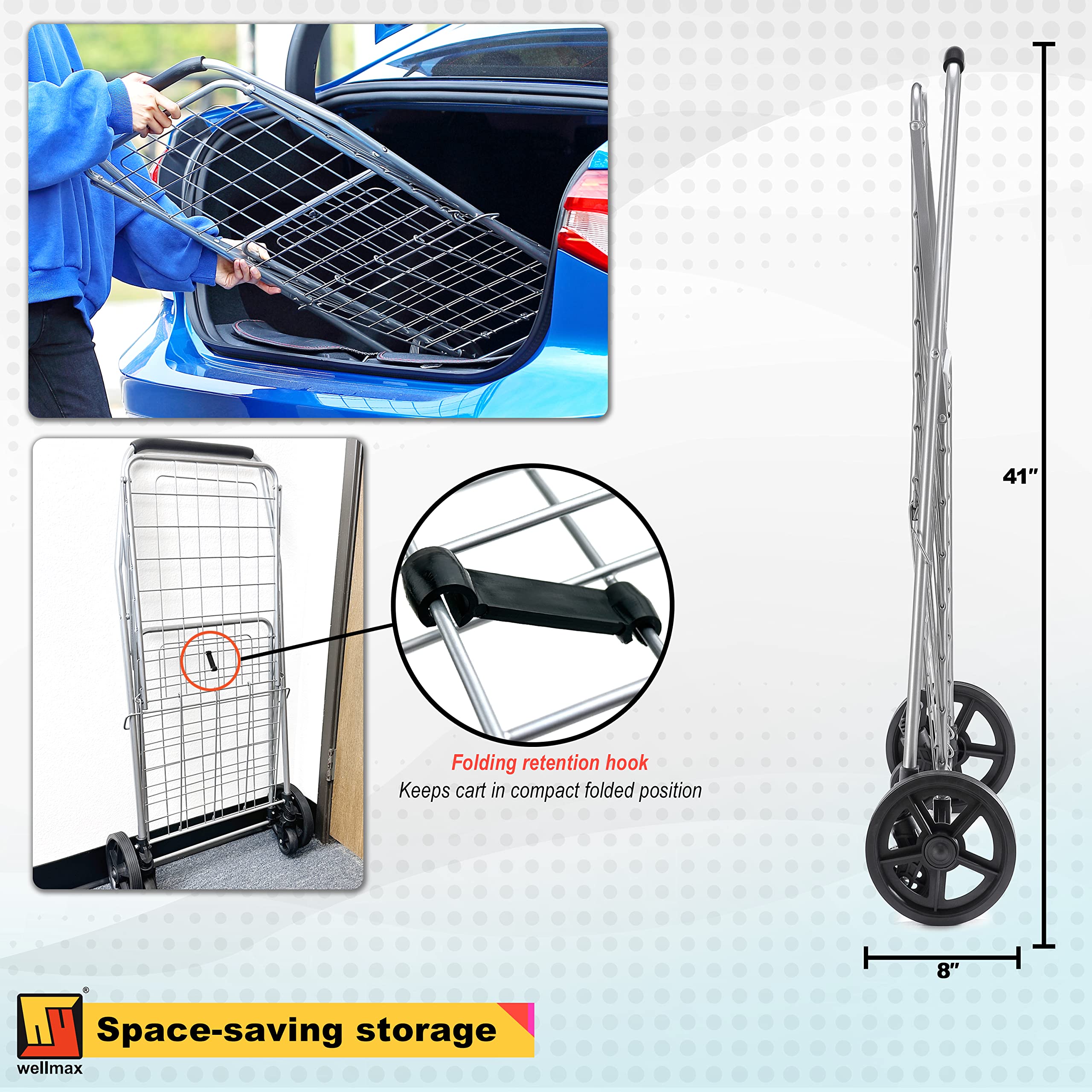 - COMPACT & LIGHTWEIGHT - Minimal assembly required, this foldable shopping cart is the perfect size for any household. Lightweight yet sturdy, the Wellmax shopping cart can fit oodles of items, up to 66 lbs. Better yet, this cart is engineered to fold flat so it wonu2019t take up valuable room your house or apartment. Functional and efficient design are two of our main priorities at Wellmax!