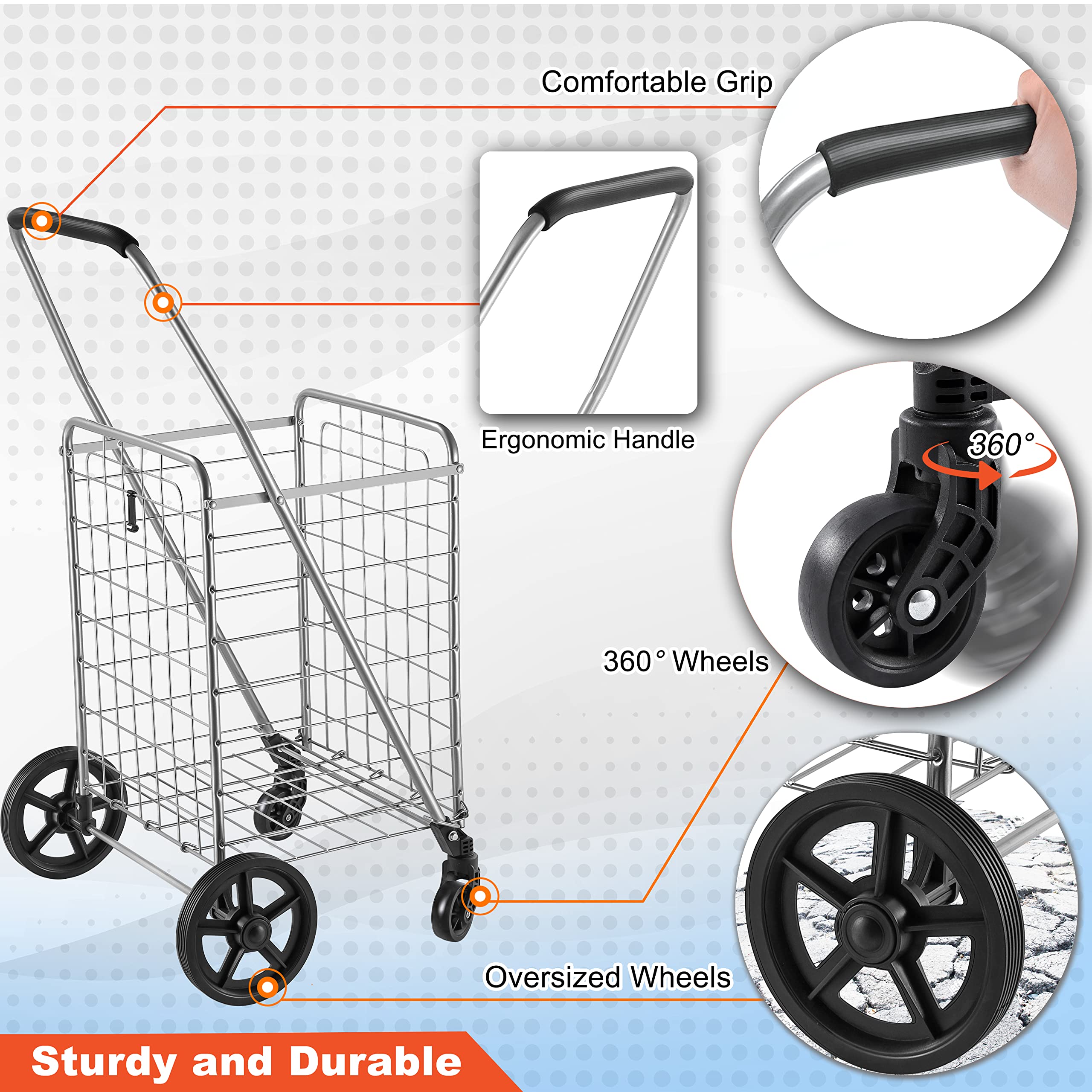 - DURABLY BUILT - Thereu2019s nothing worse than investing in a poorly made product. We are committed to engineering a cart that can sustain long-term, frequent use. Climbing the stairs? No problem. Trekking over a bumpy sidewalk? Have no fear. Using premium metal materials, this cart has been carefully crafted to withstand even the toughest wear and tear. This is your go-to shopping cart, wherever your destination may be.
