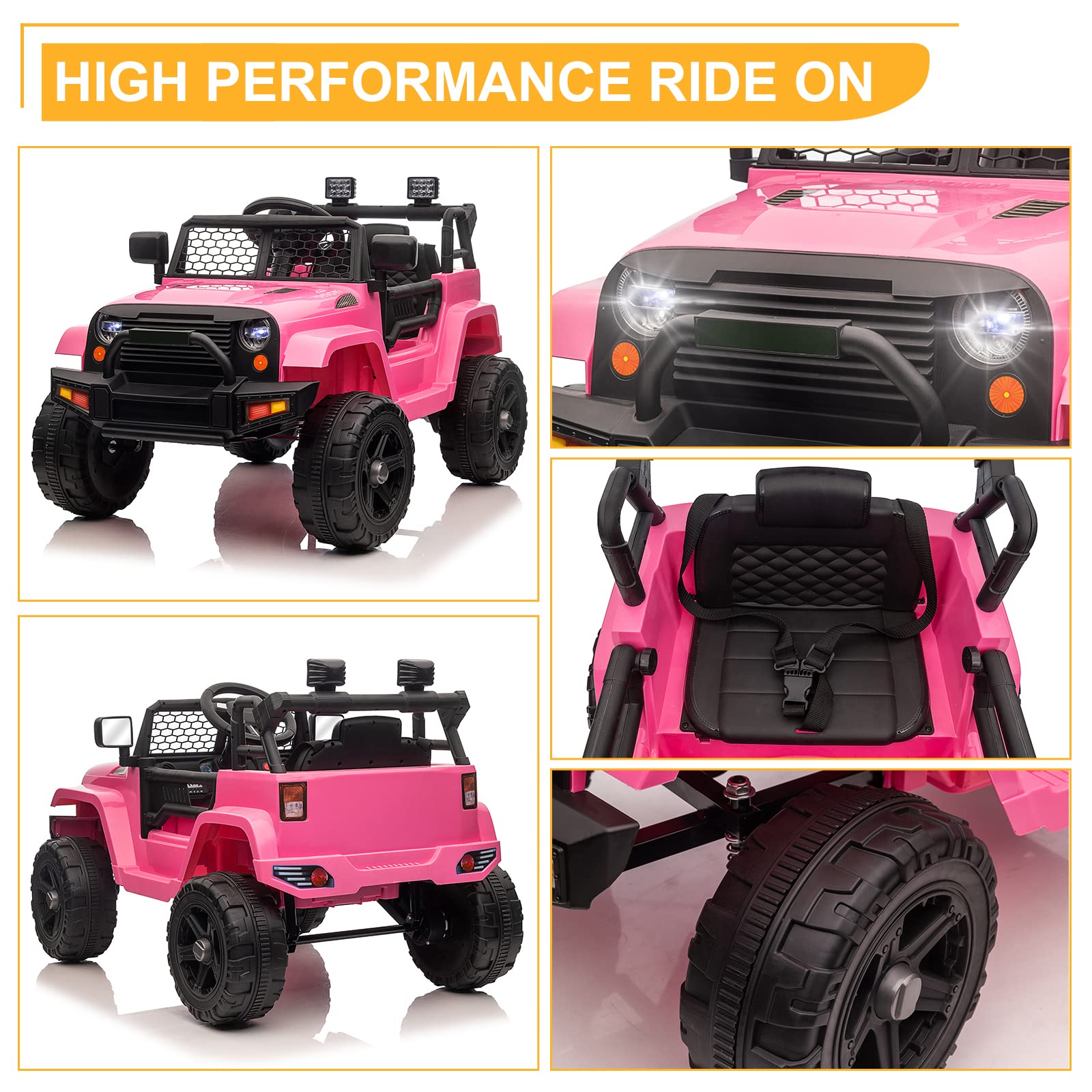 - u3010Powerful 12V & Realistic Designu3011Adjustable seat belts, bright LED headlights, openable doors and adaptable mesh windshield, equipped with 12V motor and traction tires for driving on different terrains.