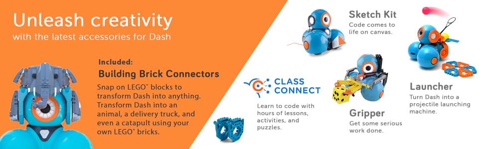 - Box Includes: 1 Dash robot, 2 building brick connectors, 1 USB charging cable. This Dash unit contains more working memory than before and an 18% longer battery life. Dash does not contain a camera