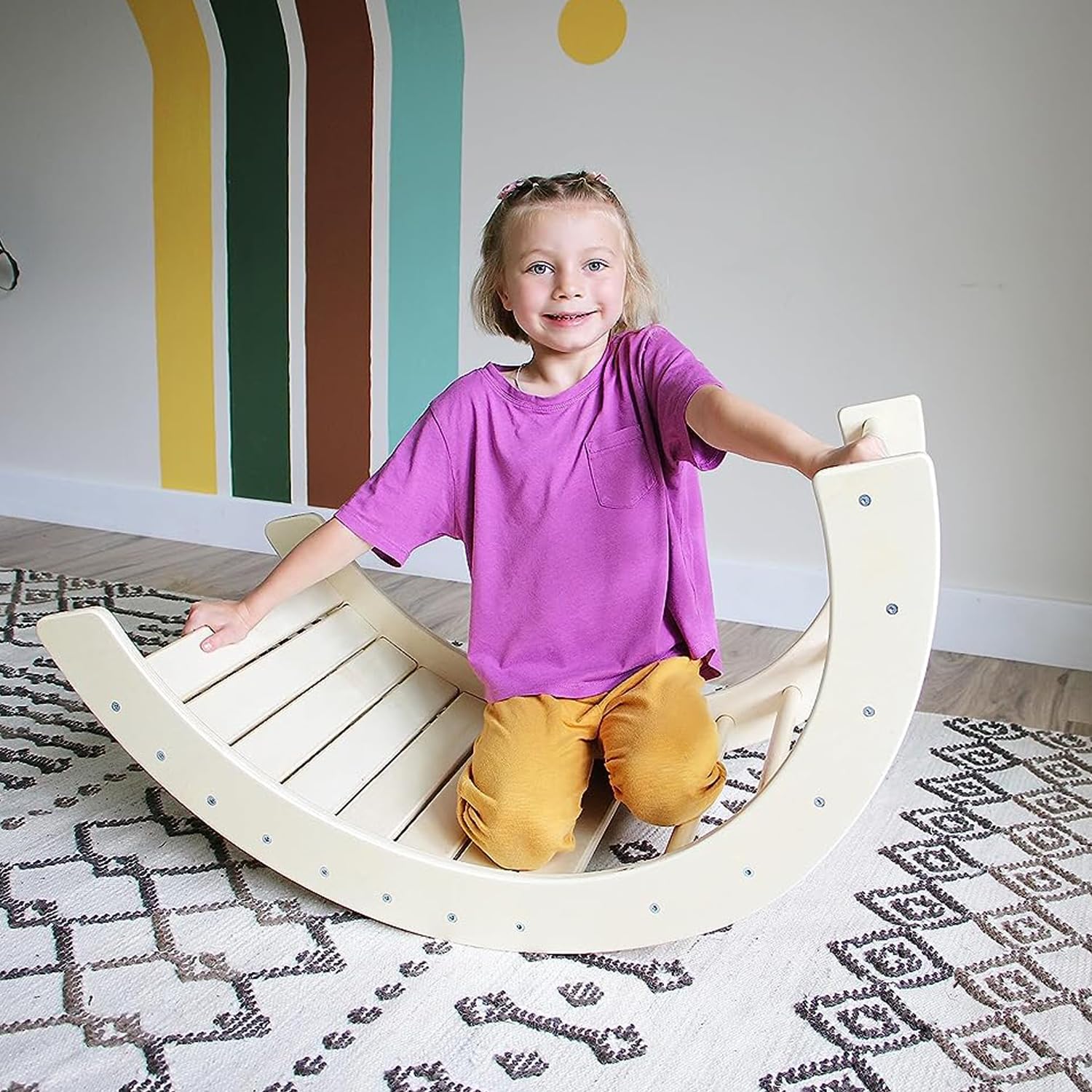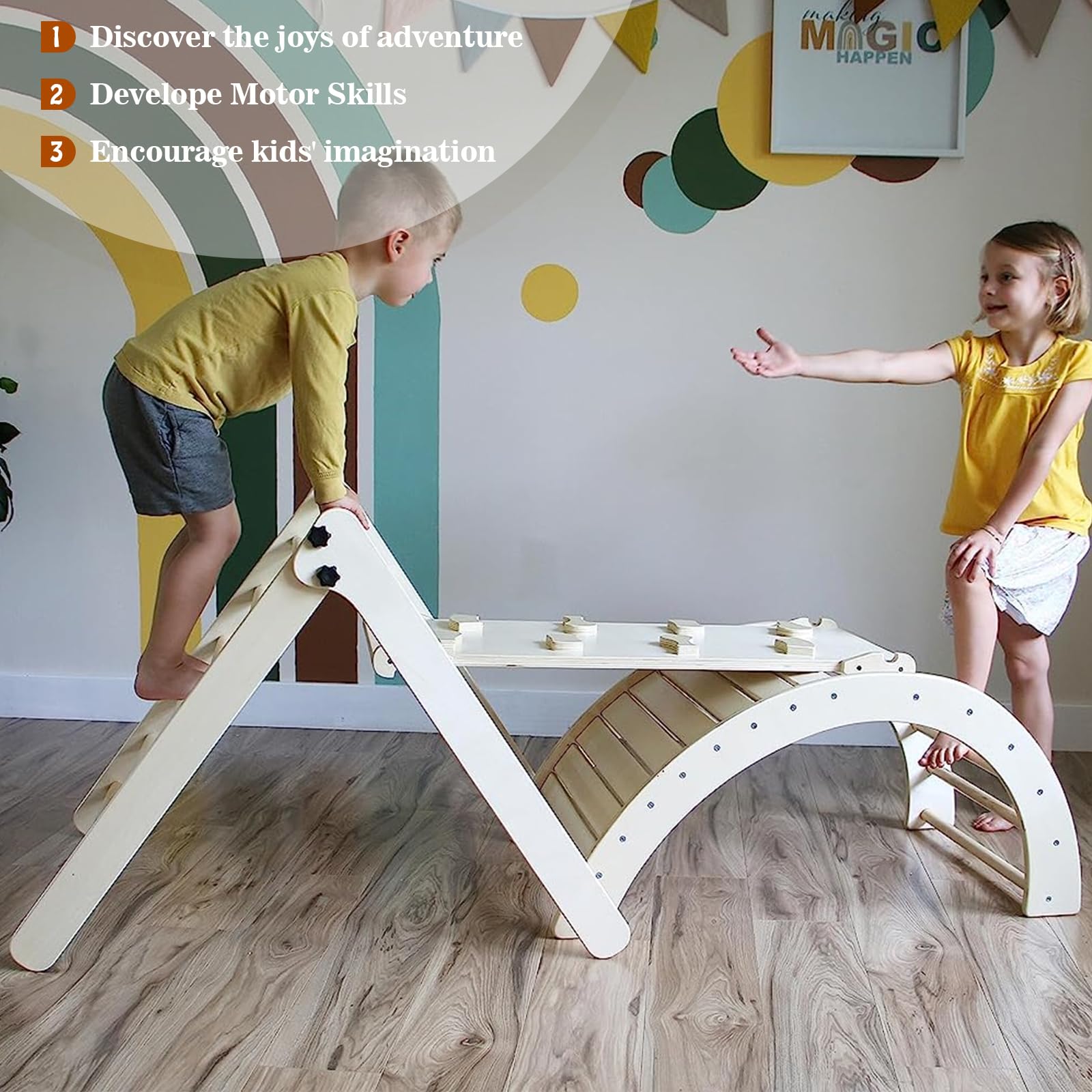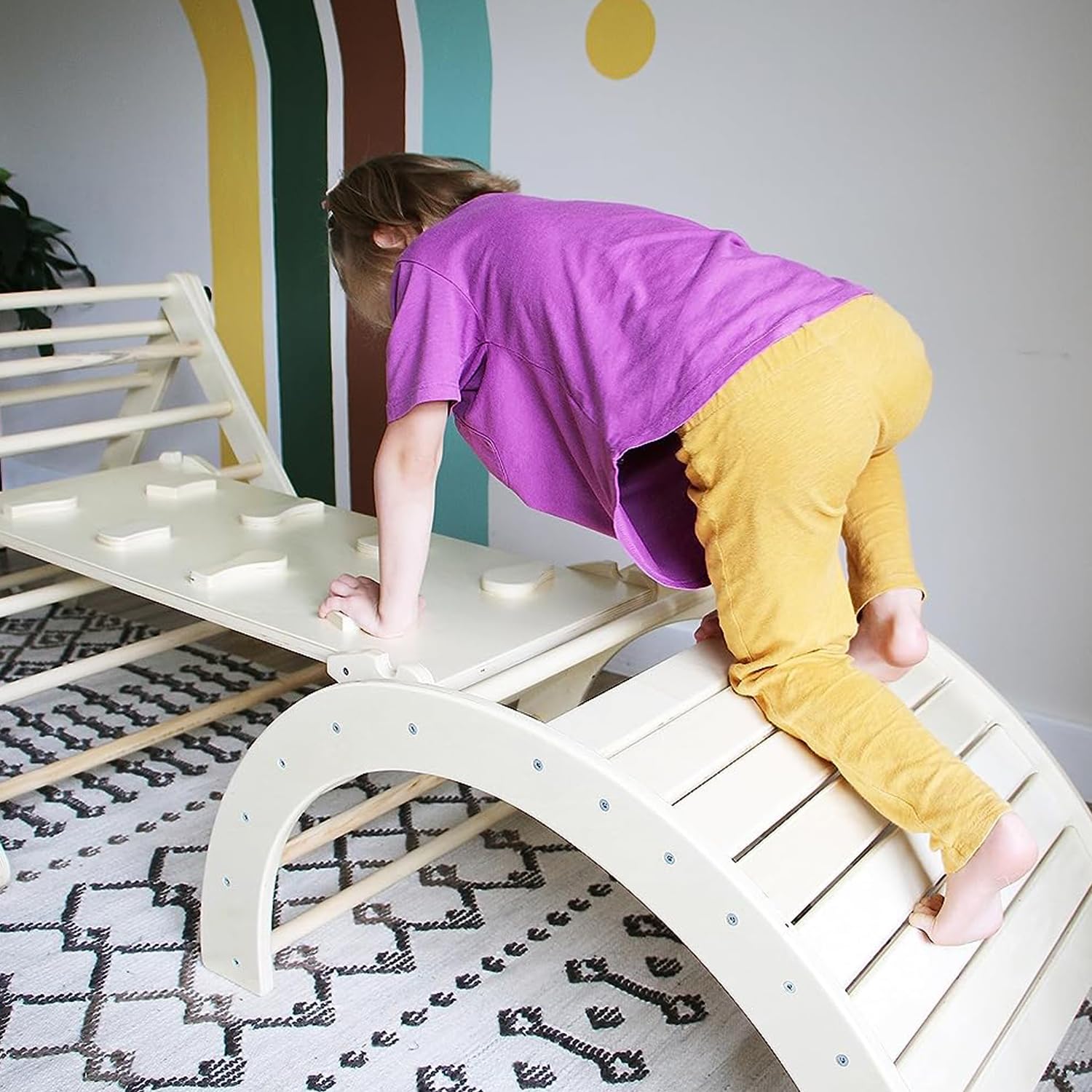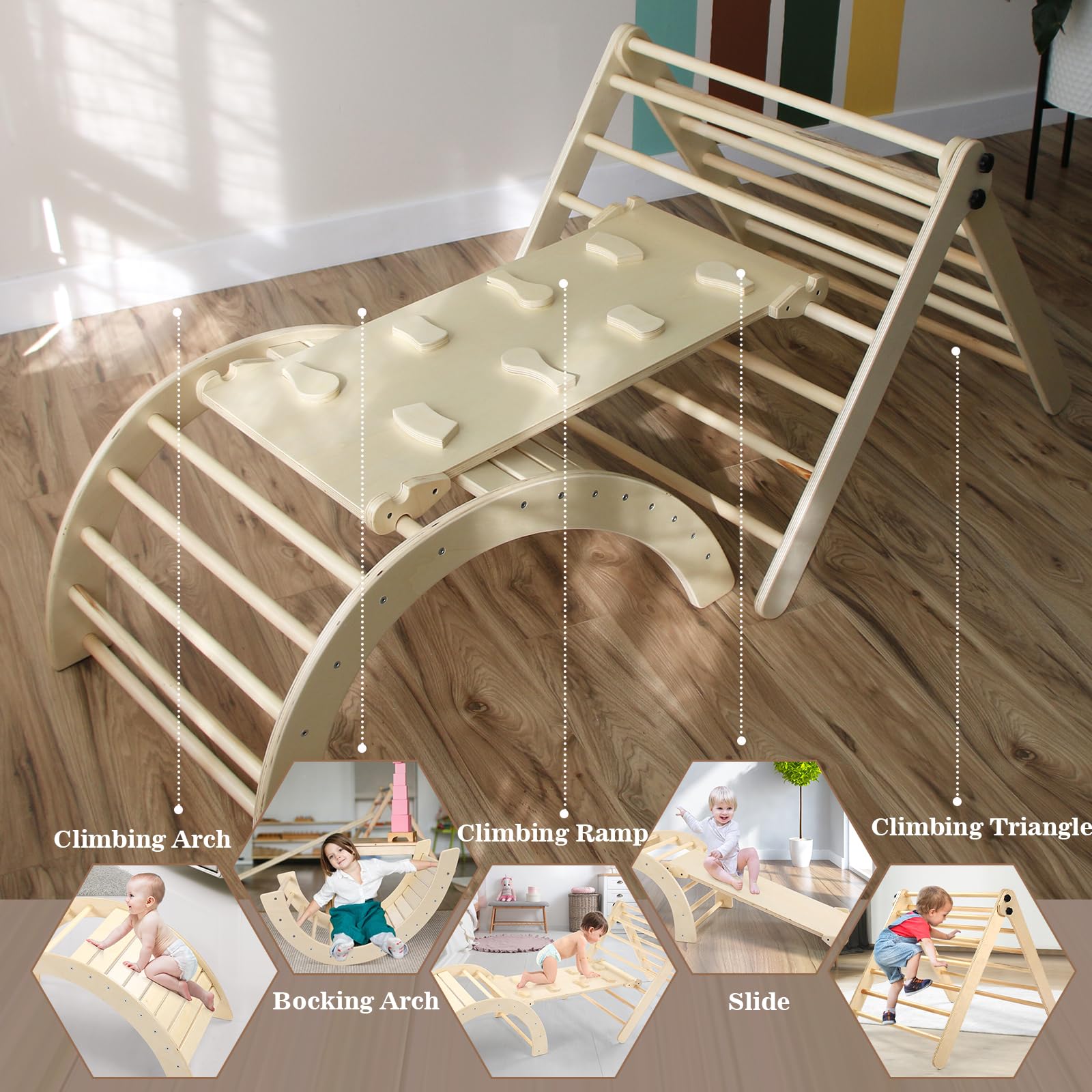- Multiple Play Modes: The 4 in 1 climbing set for kids offers 5 different play modes. Your kids can climb the arch, enjoy the rocking arch, climb the ramp, slide and climb the triangle ladder. Gift your kids a wide range of activities to choose from with our pikler triangle.