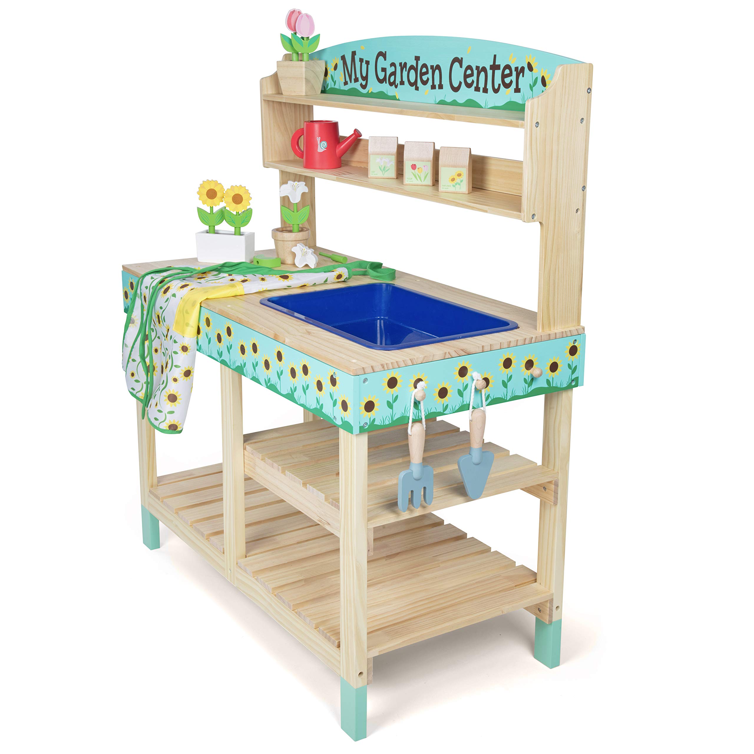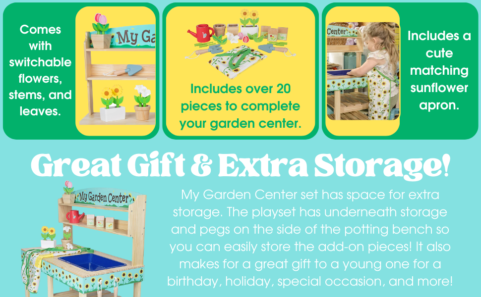 - Over 20 wooden additional pieces included to start your own personal garden: flower pots, seed packets, watering pot, shovel, hand rake, apron, and interchangable flower heads, leaves, and stems