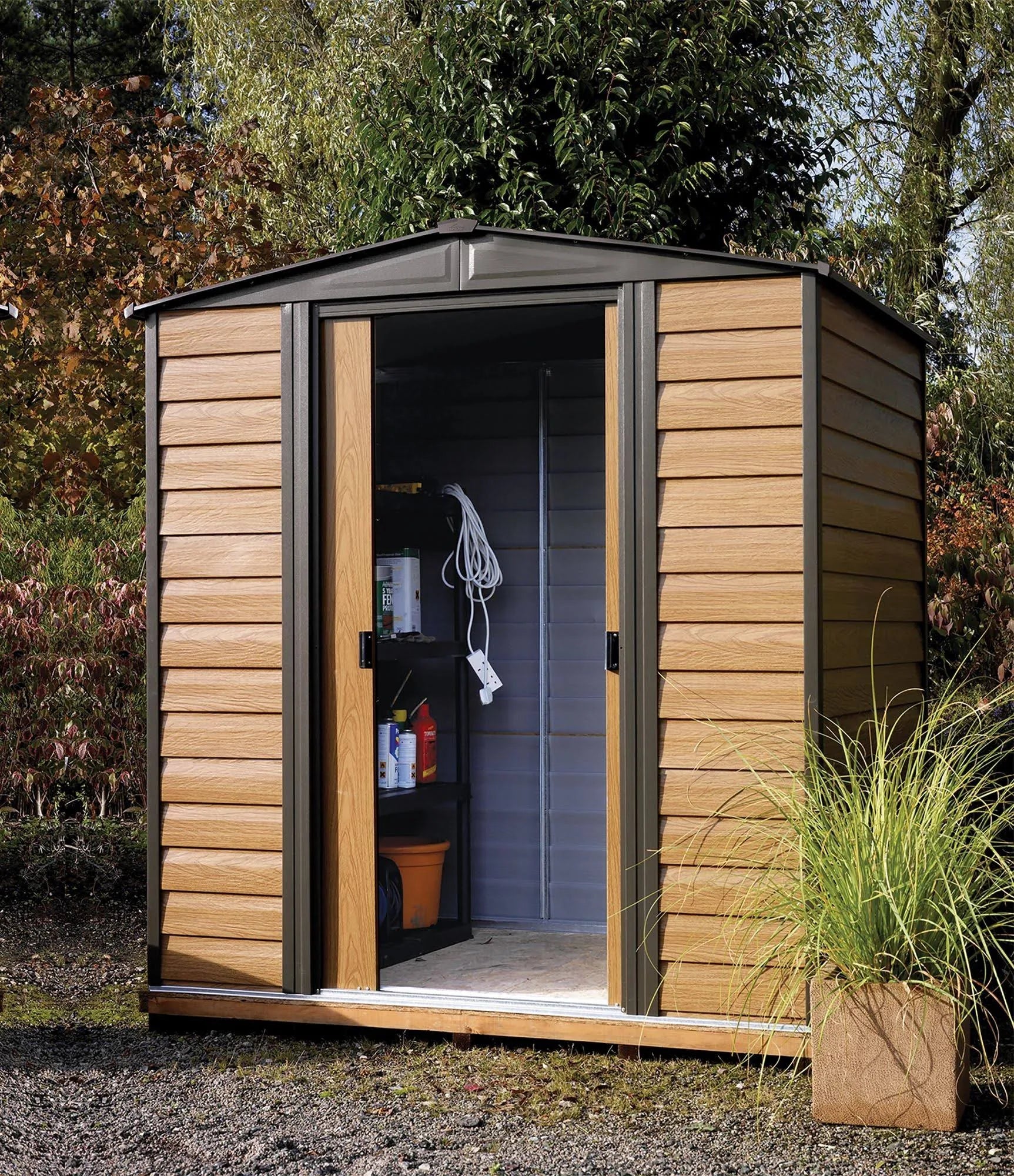 Looking for a steel shed for outdoor storage that will match your backyard space effortlessly? The Woodridge 6 x 5 ft. shed might be the perfect solution. This attractive galvanized steel shed is not only built strong, but it features and attractive wood grain exterior that's bound to match any outdoor space. Any unlike other wood grain finishes, the Woodridge looks attractive and not at all fake. Made from galvanized steel, this attractive shed offers corrosion and rust resistance. It's also resistant to damage from outdoor critters and insects due to its sturdy, durable building material. Store your outdoor items in a Woodridge 6 x 5 ft. series shed, perfect for backyard and lawn equipment and much more.