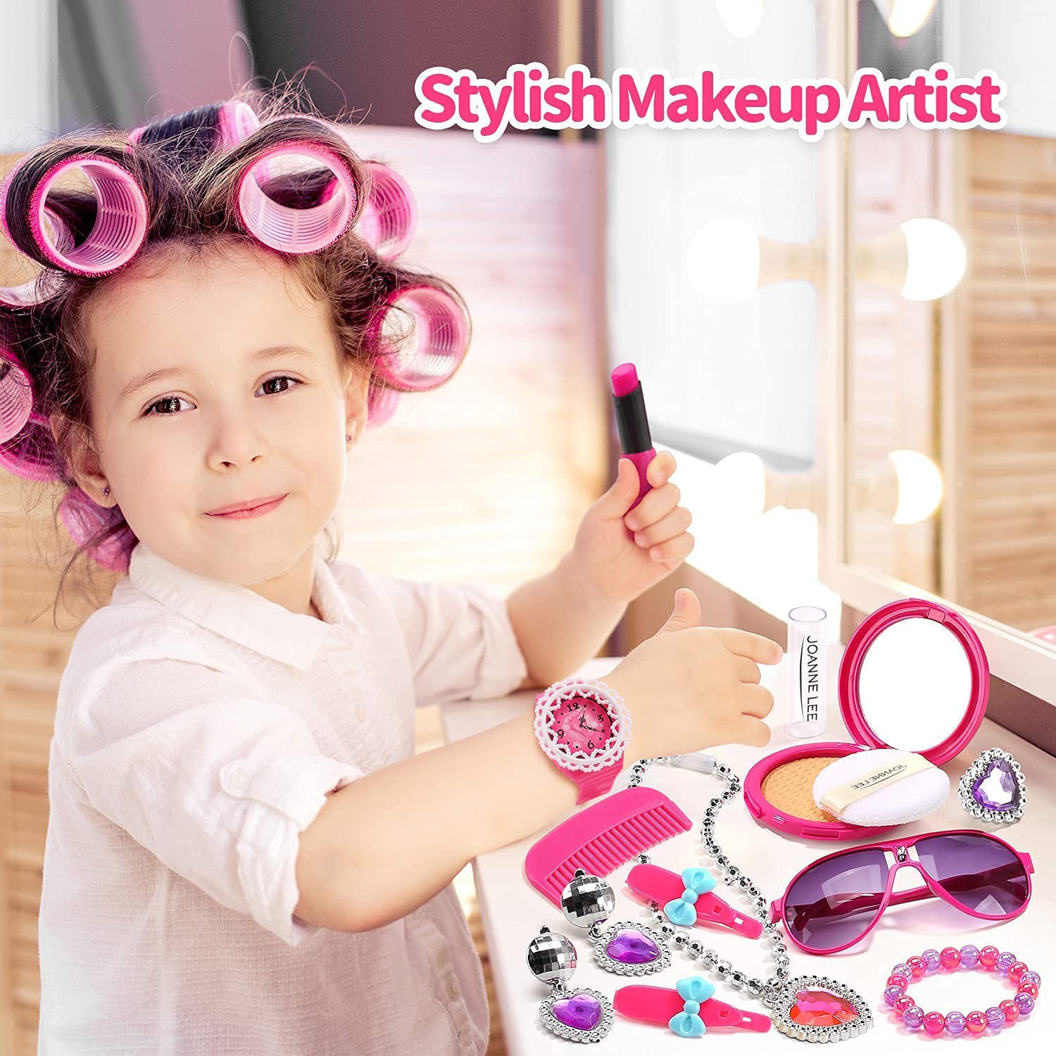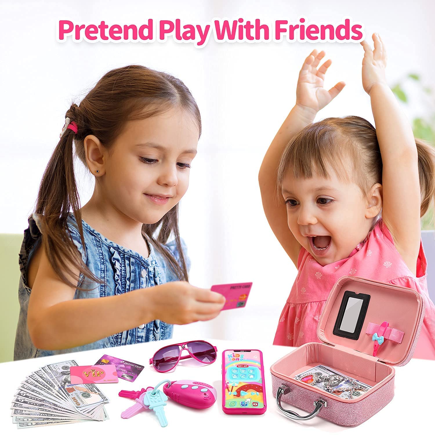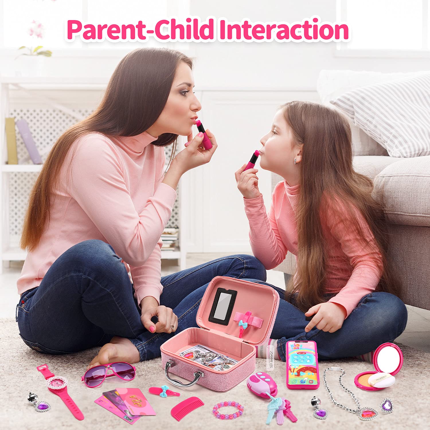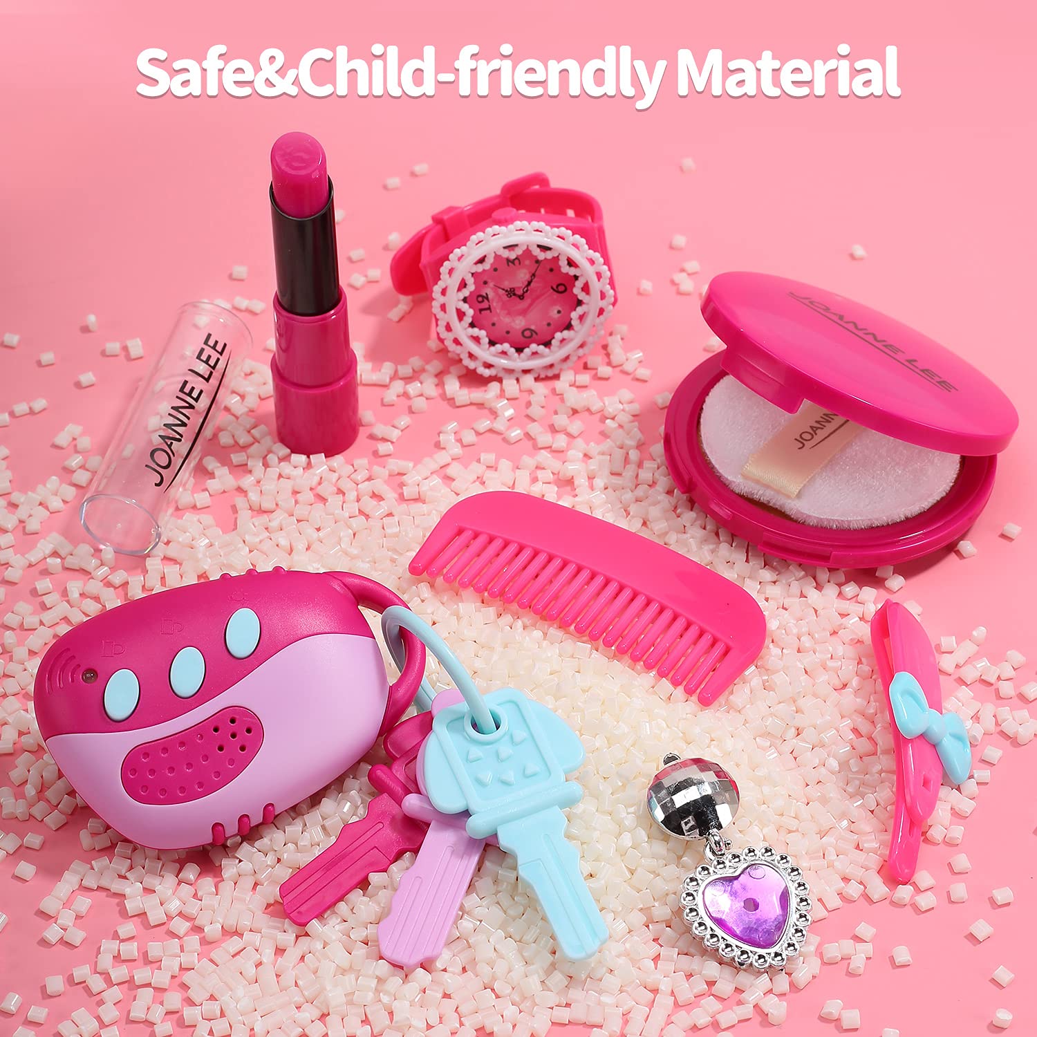 - MULTI ACCESSORIES:In a box you will get Pretend play handbag,Cellphone,Credit card,Sunglasses,Key,Ring,Hairpin,Comb,Bracelet,Necklace,Paper money,Watch,Paper screen,Earrings,Puff cake,Lipstick.(NOT REAL COSMETICS)