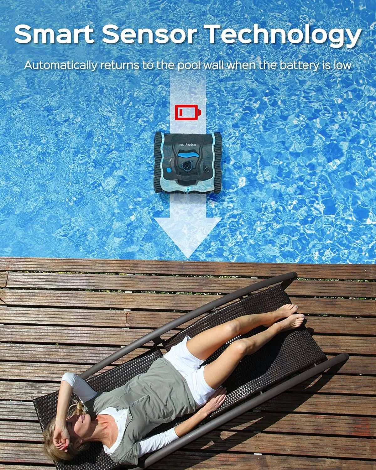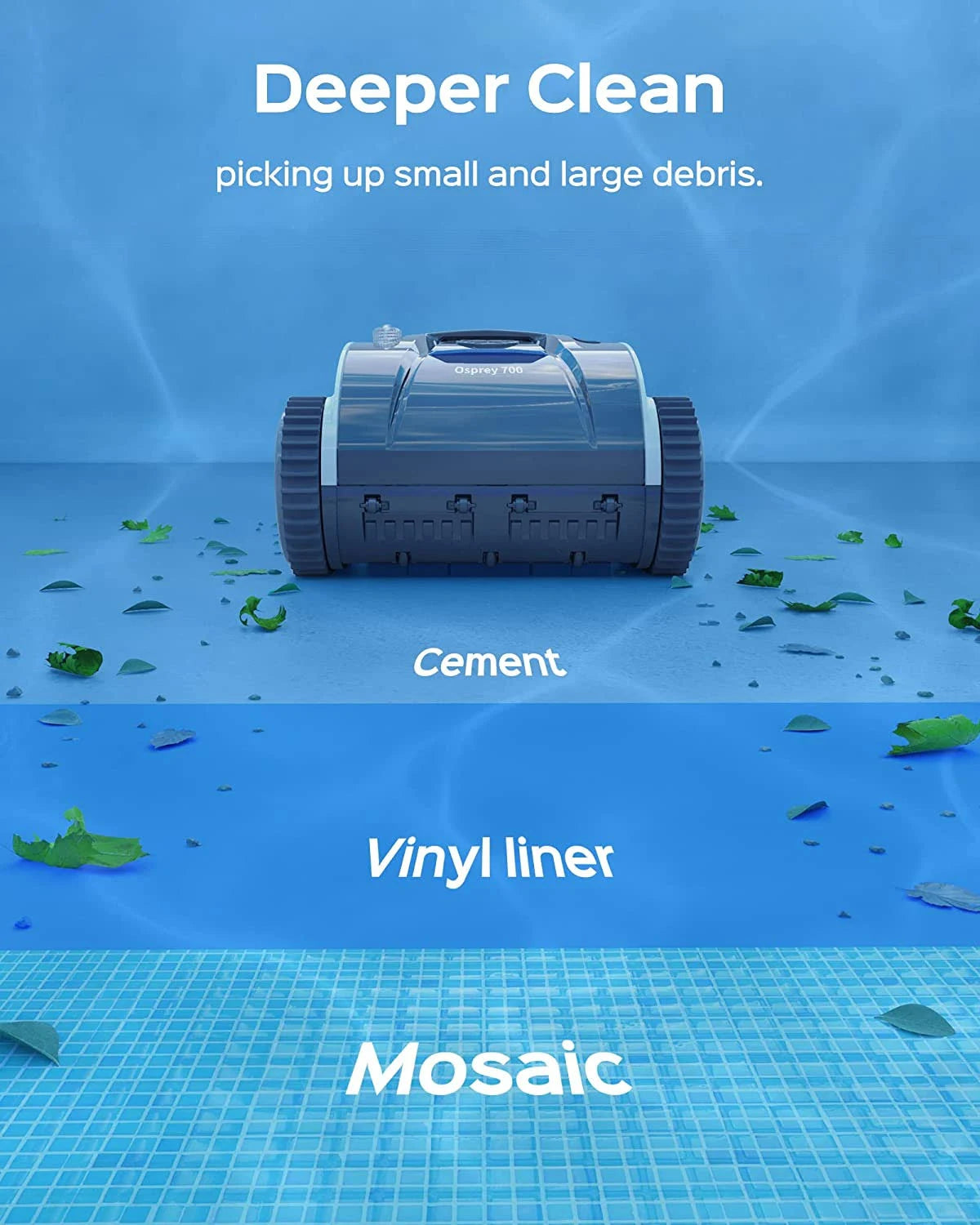 Clean the Floors, Walls, Waterline: Designed with specialized flexible scrubbing brushes and a four-wheel drive system that enable it to climb and clean the walls and floors of a swimming pool with effectiveness, leaving the pool sparkling. Increased Suction Power: Equipped with triple-motor and powerful suction that allows it to pick up sand, dirt, leaves or twigs from a variety of pool surfaces. With a width suction mouth, it can also pick up larger debris more efficiently, reducing the need for multiple passes. Saves time and effort. Longer Battery life & Rapid Charging: Easy to use, Click the button, drop and go. Osprey 700 Cordless Pool Cleaner Equipped with a best-in-class 8800 mAh rechargeable battery have a continuous run time of up to 110 mins, which is suitable for in ground pools up to 60 feet. A full charge takes only about 3.5 hours. Intelligent Path Planning&Maximum Coverage: The unit has 2 types of path planning, a star path, and a regular wall-climbing path. With advanced sensors and gyroscopes capable of navigating, the robotic pool cleaner is a great investment for any homeowner looking to make pool maintenance easier. Unmatched precision mapping and navigation result in methodical coverage with fewer missed spots.