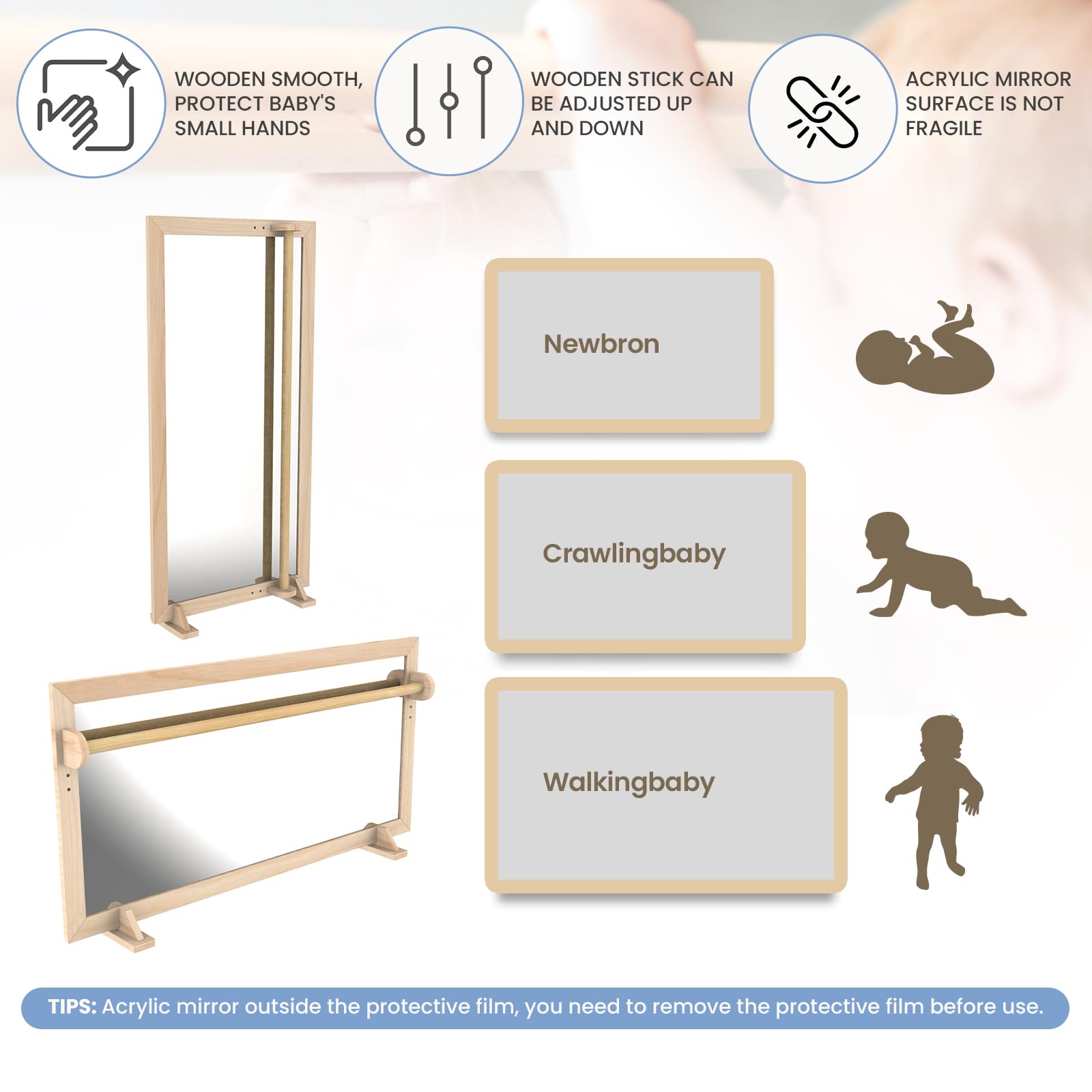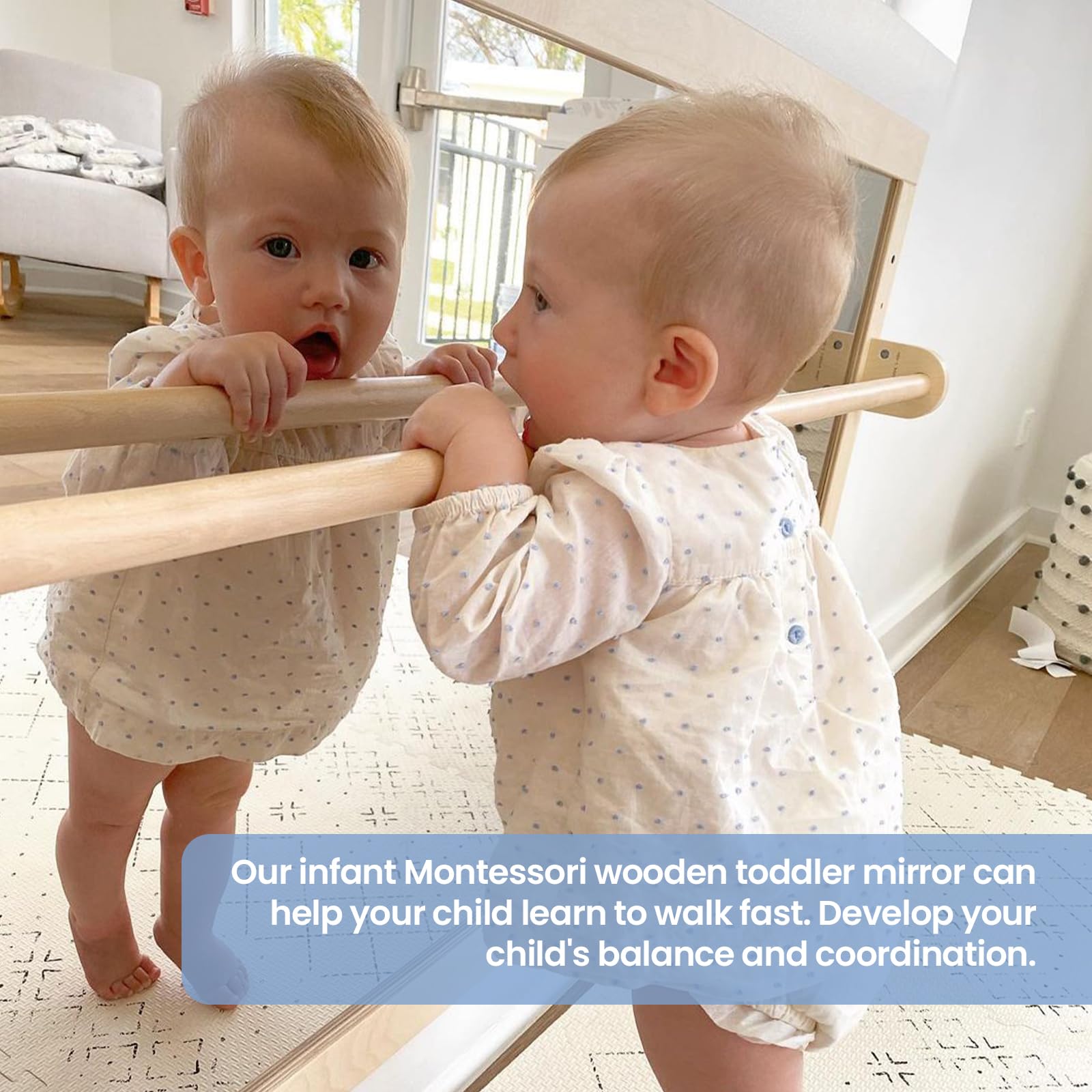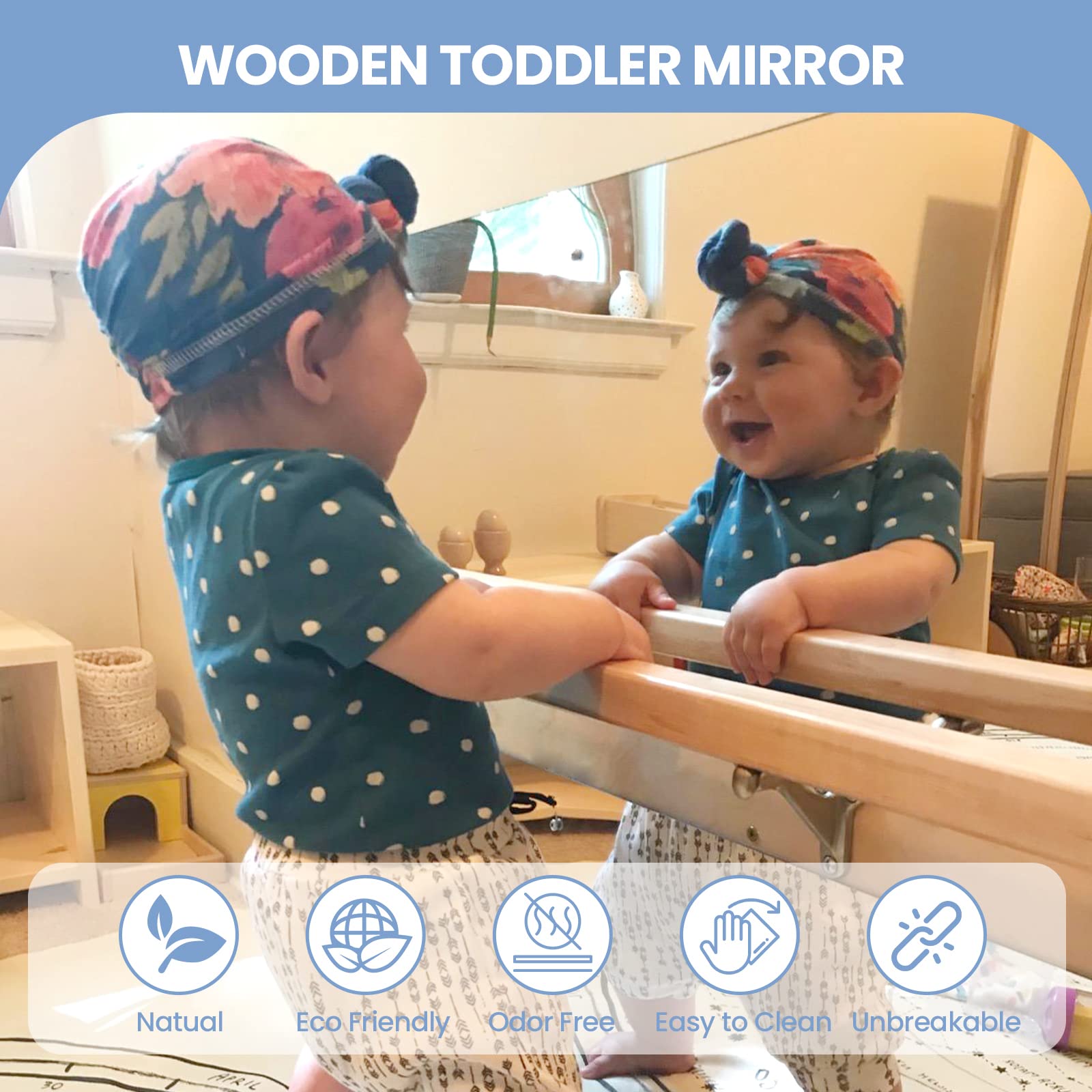 - u3010BENEFITS FOR INFANT DEVELOPMENTu3011Are you still worried about your baby's toddler skills? Our infant Montessori wooden toddler mirror can help your child learn to walk fast and keep your hands free. Develop your child's balance and coordination and let them discover their reflection in the shatterproof, non-distorting mirror. Helps develop motor skills, hand-eye coordination and more. Excites babies as they learn to pull up and balance on the track.