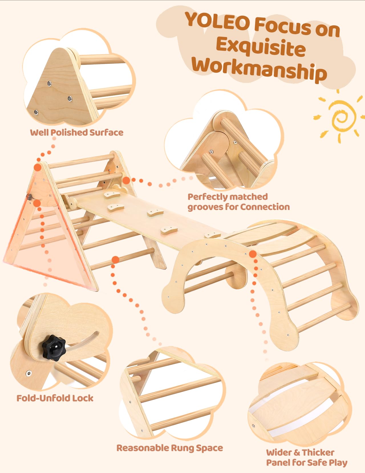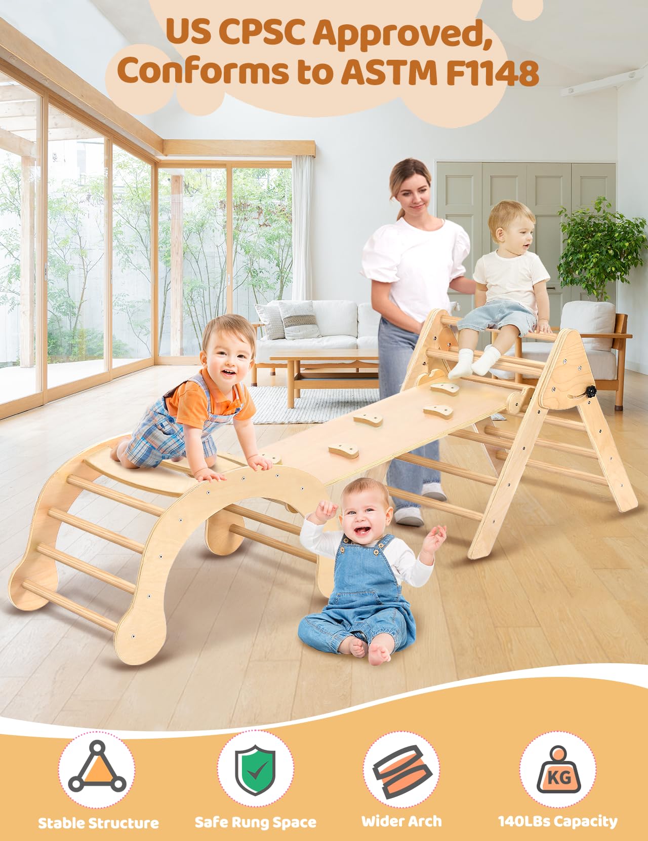 - ud83cudf85u3010ud835udc04ud835udc31ud835udc2aud835udc2eud835udc22ud835udc2cud835udc22ud835udc2dud835udc1e ud835udc16ud835udc28ud835udc2bud835udc24ud835udc26ud835udc1aud835udc27ud835udc2cud835udc21ud835udc22ud835udc29 ud835udc2dud835udc28 ud835udc0aud835udc1eud835udc1eud835udc29 ud835udc12ud835udc1aud835udc1fud835udc1eud835udc2dud835udc32u3011ud83cudf81 Playing should be fun, but also safe. All Yoleo climbing toys are rigorously tested and certified by CPSC approved labs. Made of superior natural wood and non-toxic paint, after hundreds of polishing and sanding, the Yoleo pikler climber set is smoother, stronger, safer, and more durable. (And look great in your living room). The maximum weight capacity of this climbing set is 130 pounds, which allows 2-3 children to play together.