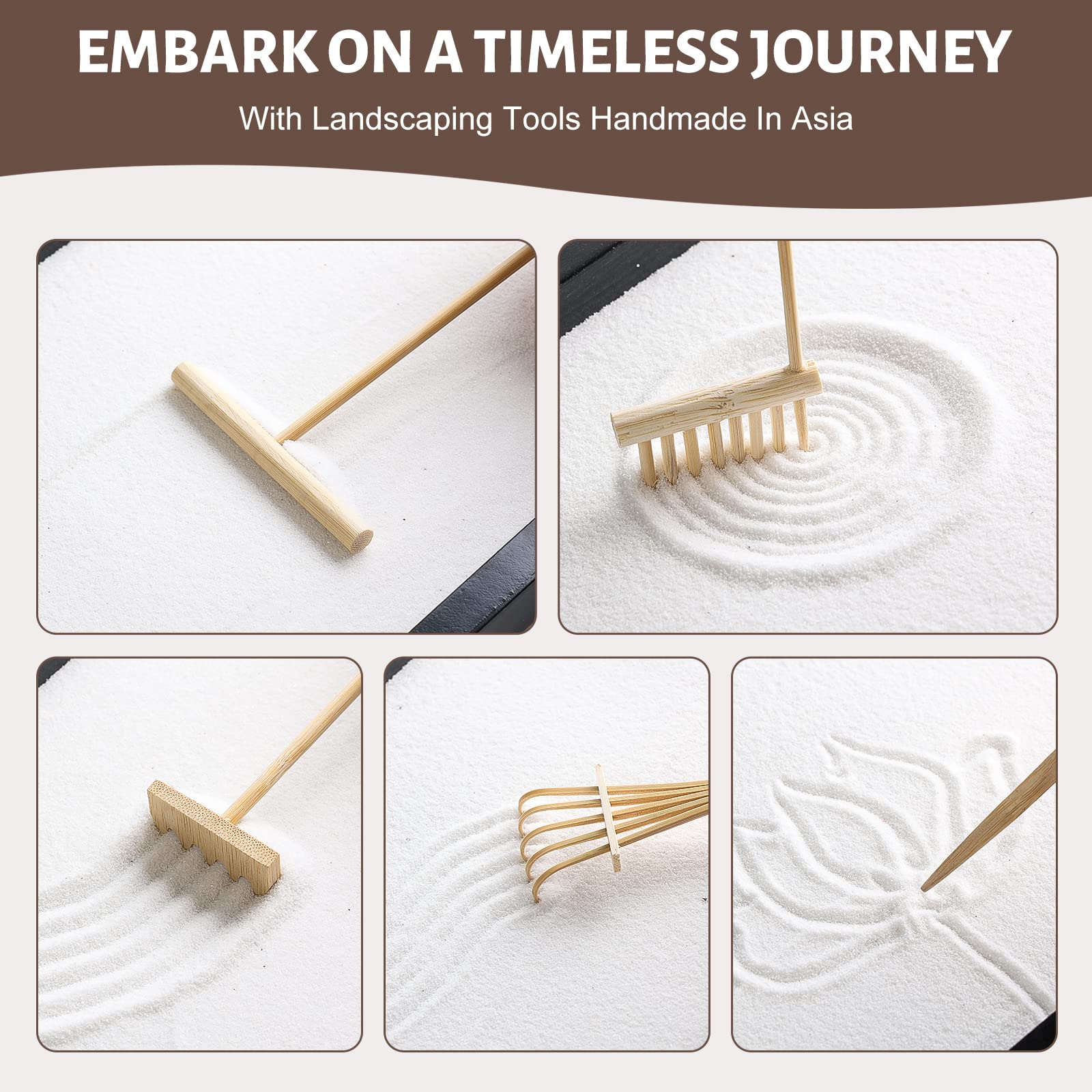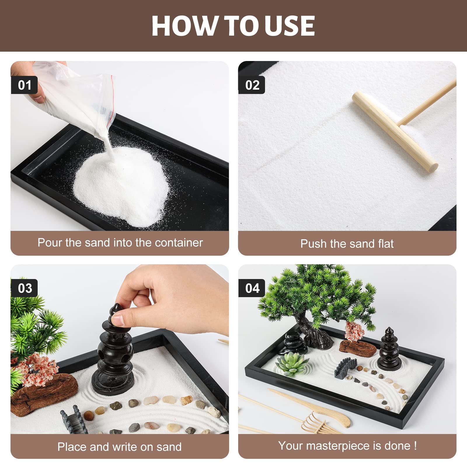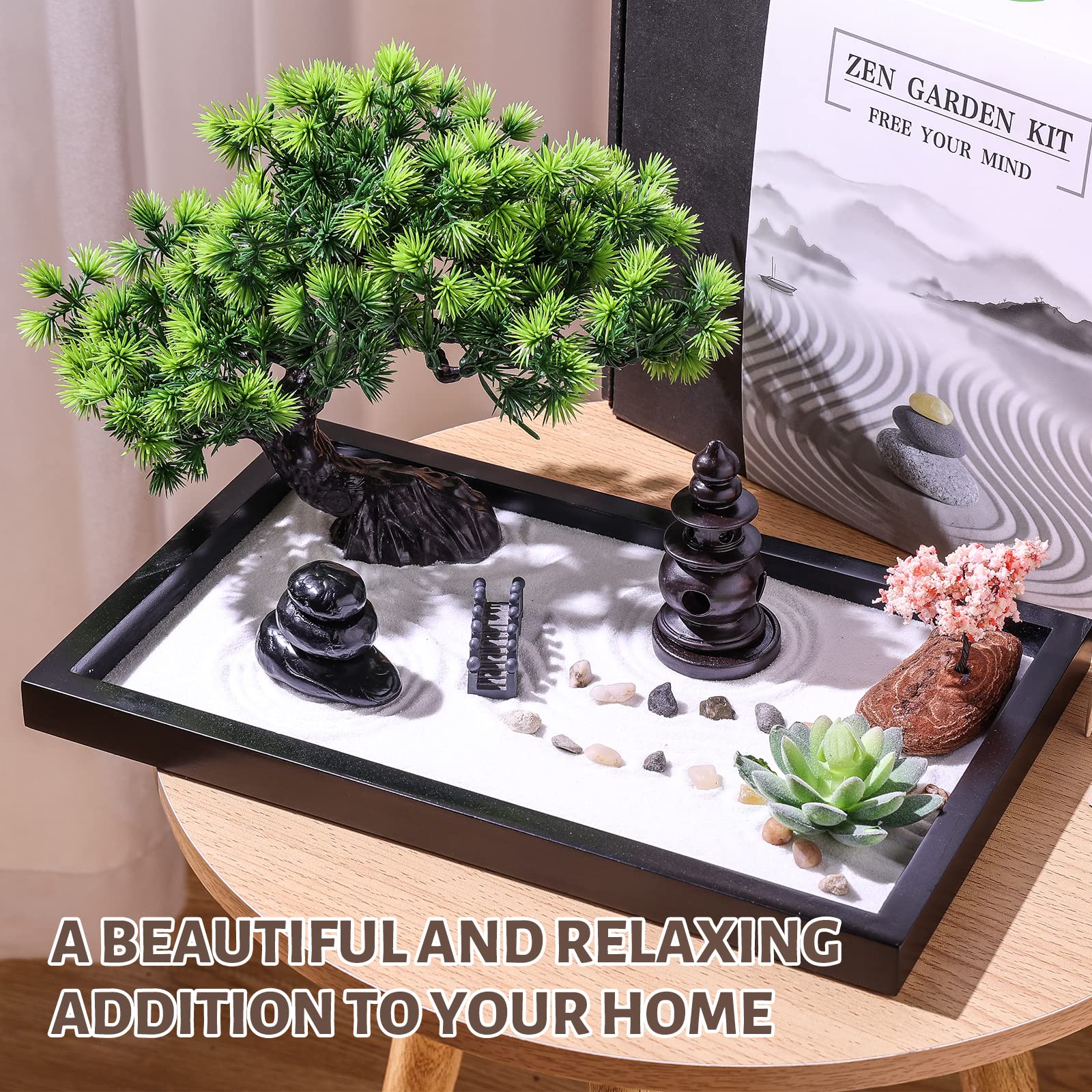 - u2618ufe0fu3010DESK ZEN GARDEN SETu3011 - The Japanese zen garden kit include 14 items, a black 32x20x2cm wooden tray with white zen sand, zen stacking stones, Succulents, bonsai tree and cherry blossom mini tree, pagoda and bridge, and 5 different unique meditation accessories and traditional tools; Enclosed a information booklet to help discover the history and meaning of Japanese Zen garden and its features. This Japanese Decor Bring balance and serenity to your coffee table, office desk ...