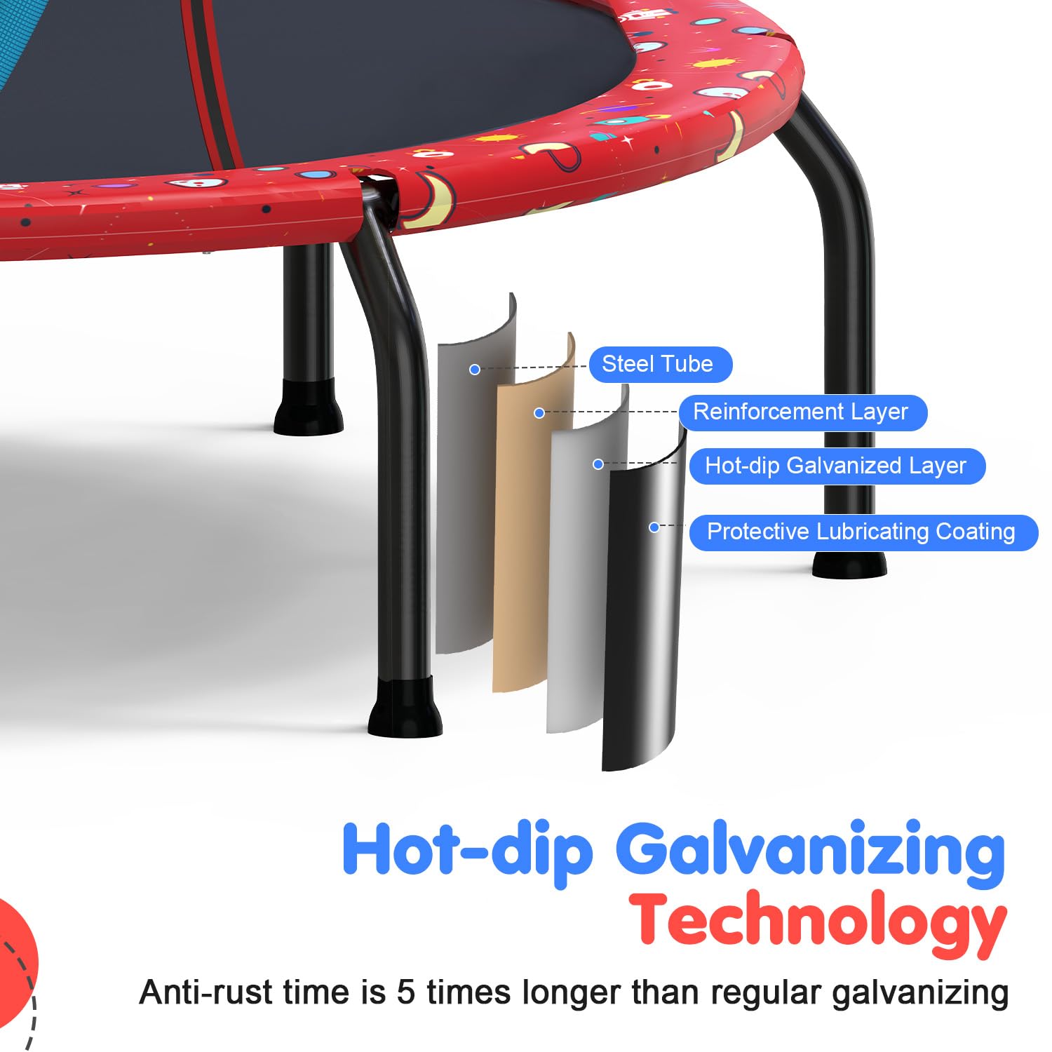 - u2764ufe0fu3010Stronger Material & Sturdy Trampolineu3011To enhance the sturdiness and stability of our trampoline, we opted for thicker steel pipes with a wall thickness of 1.2mm, surpassing the standard 0.9mm. In addition, our galvanized rust-proof legs effectively prolong the lifespan of the trampoline.