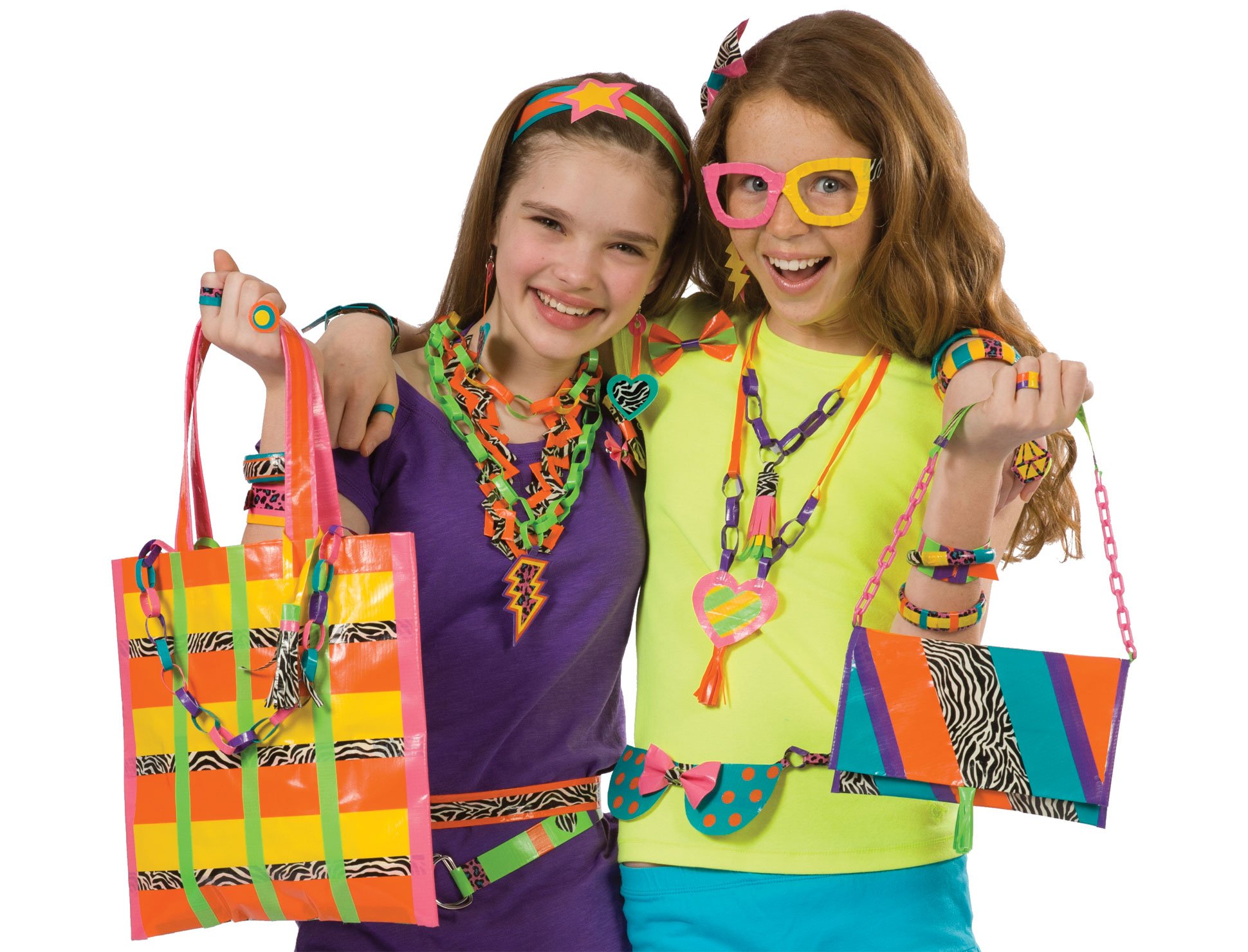 - Includes 12 rolls of duct tape, 4 jump rings, 2 metal D Rings, 4 earring hooks, 2 stretchy loops, 3 bangles, hole punch and a brooch pin