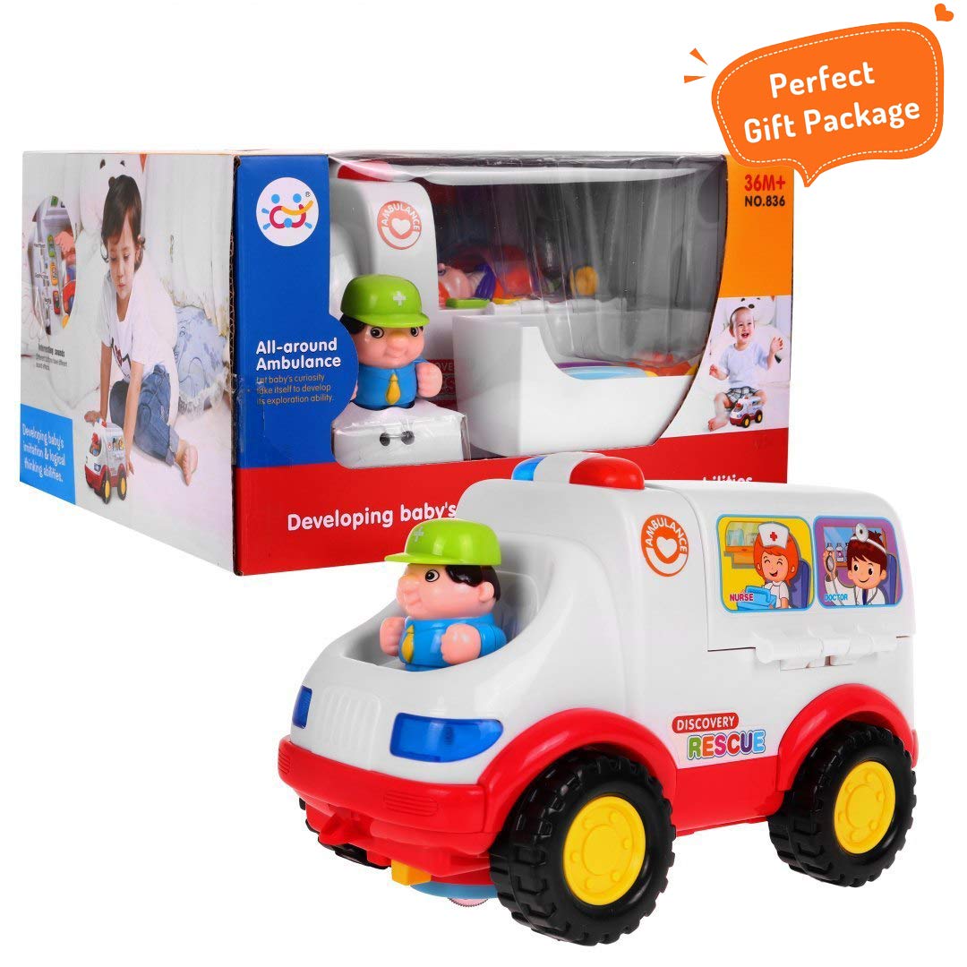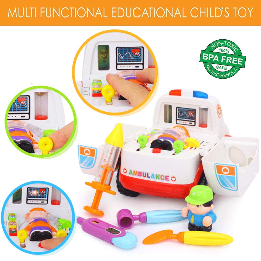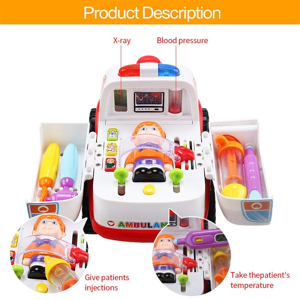 - u2705 LIGHTS & MUSIC: Press the button on the ambulance to hear the sound of heartbeat, stomach sound, and the vehicle move with ambulance sirens and light. Option to turn the music OFF while truck is in action for quiet play.