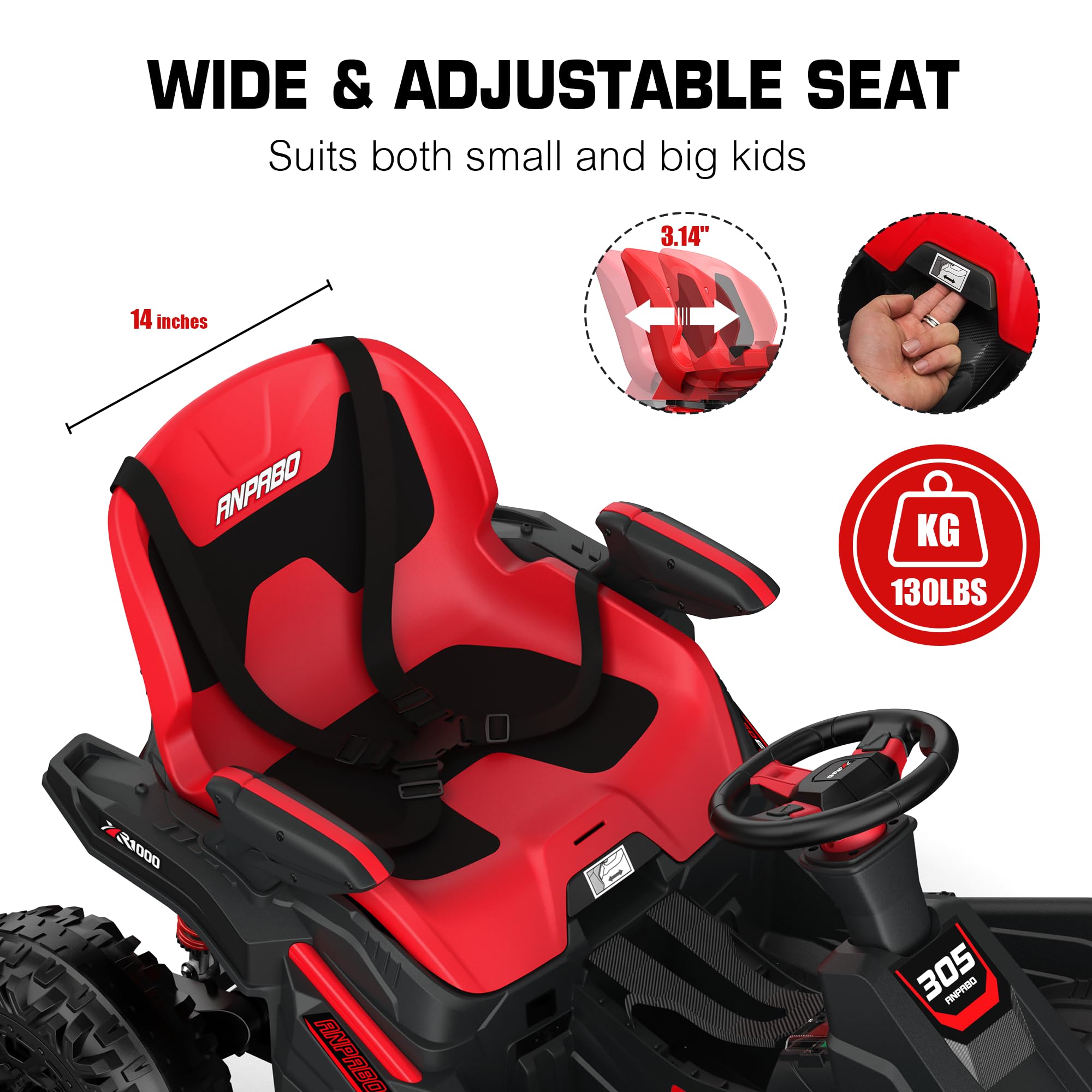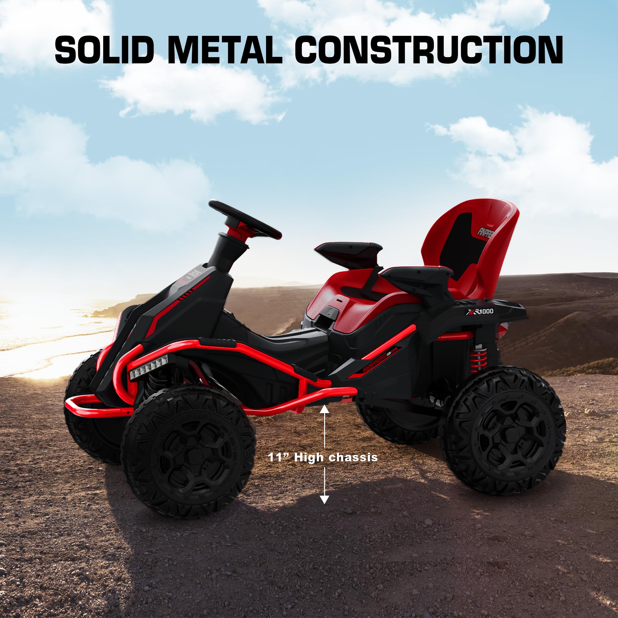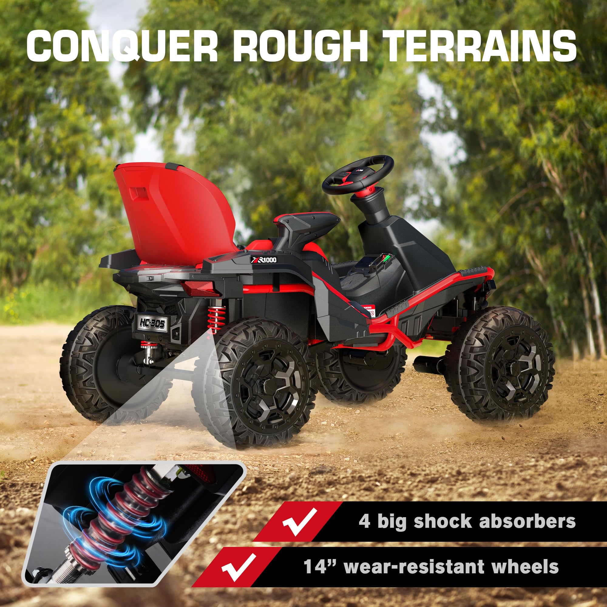- Made for Off-roading: The metal frame, unlike those plastic ones, is much more durable and long-lasting. The 14u2019u2019 larger-diameter wear-resistant wheels and 4 big spring suspensions are designed to do off-roading for getting stronger traction and smoother rides on kinds of terrains. And the high chassis design makes it has no issue traversing rough terrains, such as gravel driveways and small mounds.