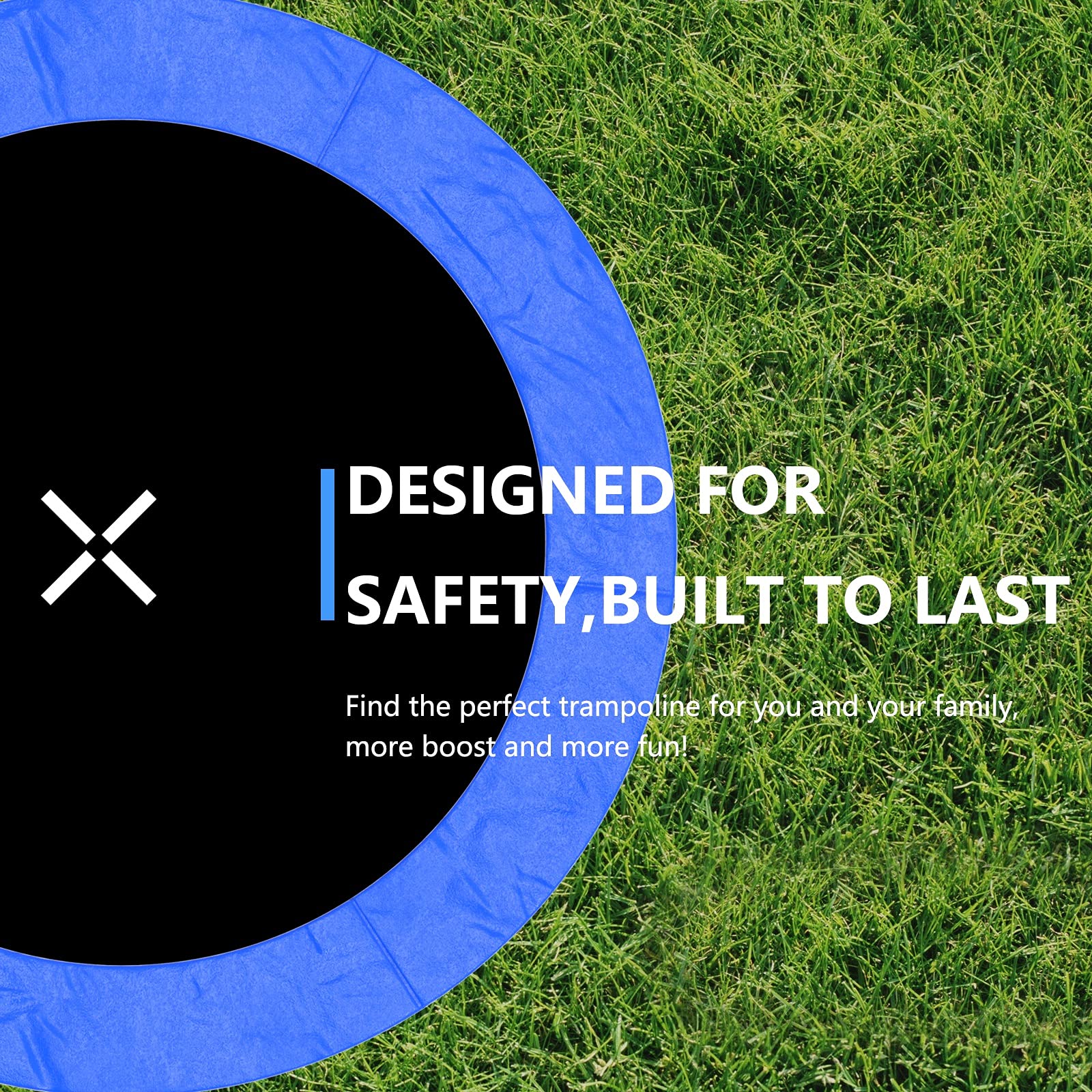 - Trampoline safety is our top priority when jumping happily. We design safety for trampoline. The jump pad and the spring cover are close together to avoid the foot sole being caught by the spring during use.The 12 ft trampoline adopts a widened design, which increases the area used for jumping. The thickened and increased anti-rust steel structure and 5 U-shaped big legs with 10 balanced contact points to increase the stability of the trampoline.