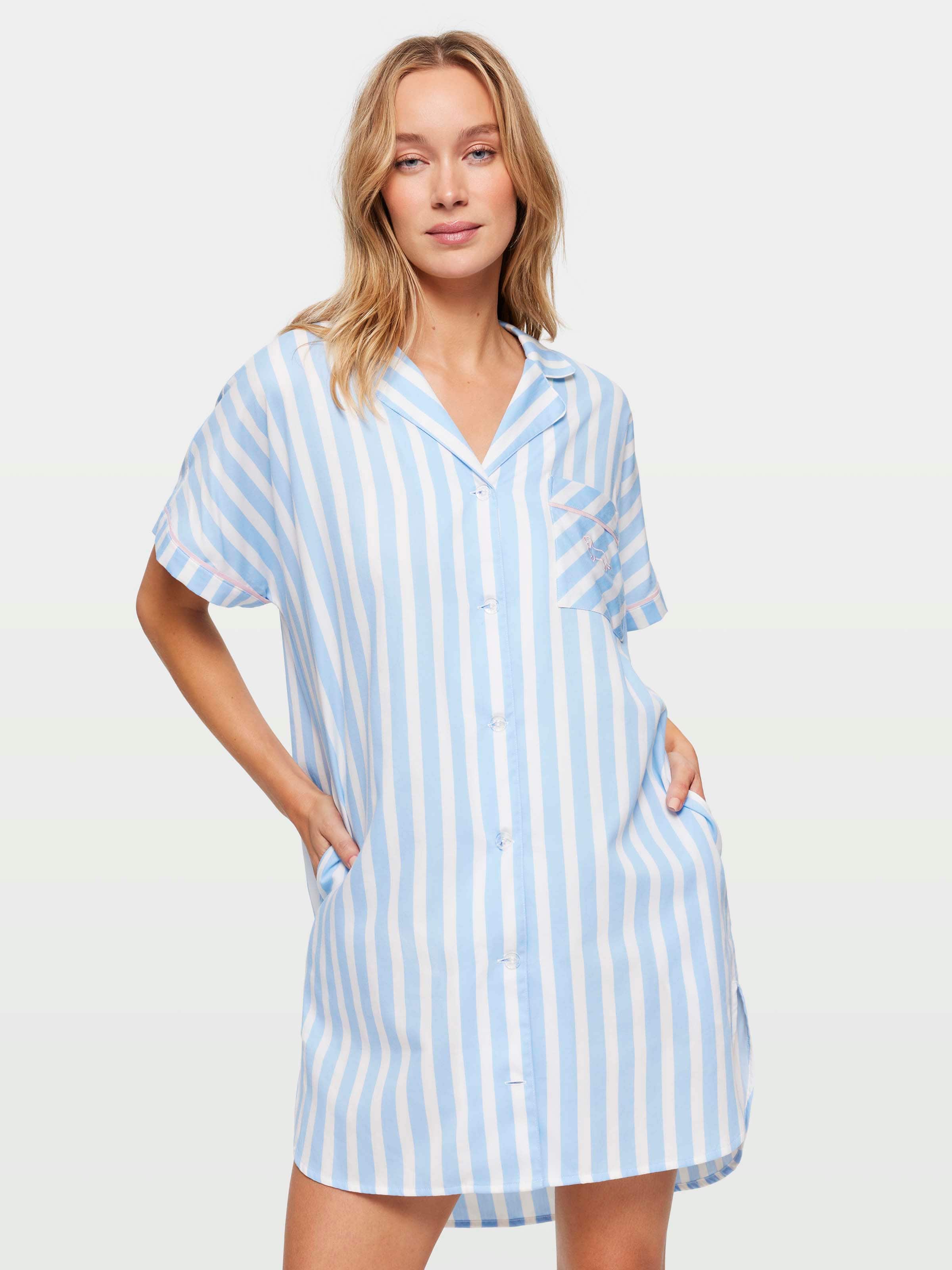 Summer is the perfect time for putting your feet up and relaxing, with the help of this oversized boyfriend nightshirt! This striped sensation features contrast pink piping and a quirky cross-print pocket.