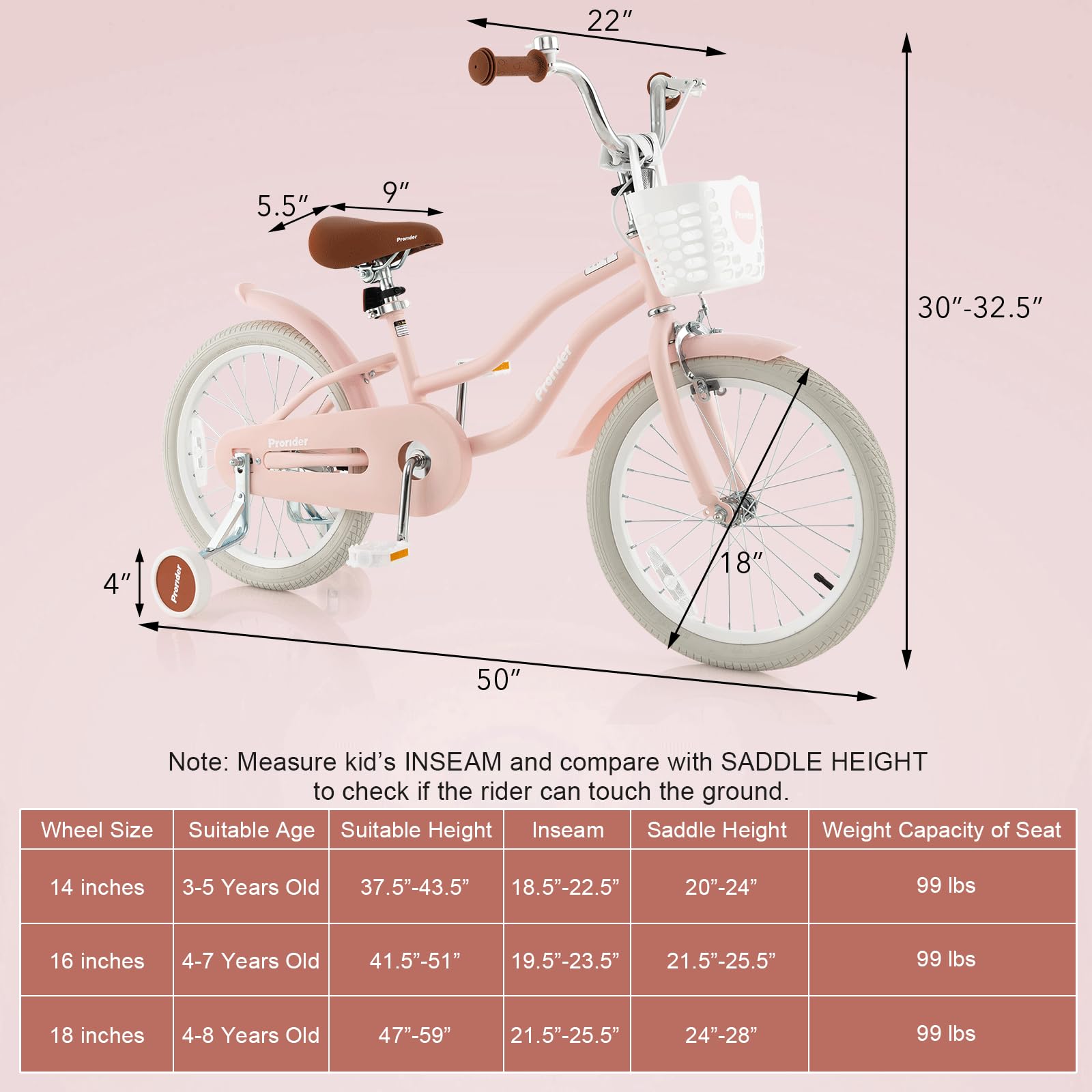 - [ Size Recommend ]: 14" bike is suitable for boys and girls age 3 to 5 years old ( height 37.5"-43.5" ) ; 16" for 4 to 7 year old ( height 41.5"-51" ) ; 18" for 4 to 8 year old ( height 47"-59" ). Note: Measure kidu2019s INSEAM and compare with SADDLE HEIGHT to check if the rider can touch the ground.